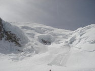 Abfahrt führt auf weiten teilen an Eis Seracs vorbei die zu immer runter fallen können unabhänig von der Witterungund Zeit da kann man nur hoffen jetzt nicht runter kommen einander mal.