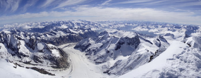 Wir sind am gleichen Tag nach dem Gipfel noch über die Grünhornlücke, Grüneggfirn, Aletschgletscher (der nasse Schnee gleitet Mittags nicht gut - viel Schieben), Märjelenseen durch den Tunnel zur Fiescheralp (letzte Talfahrt 17:30 Revision) zurück in die Zivilisation. Das hat sich dann etwas in die Länge gezogen. In drei Tagen wahrscheinlich wesentlich entspannter.