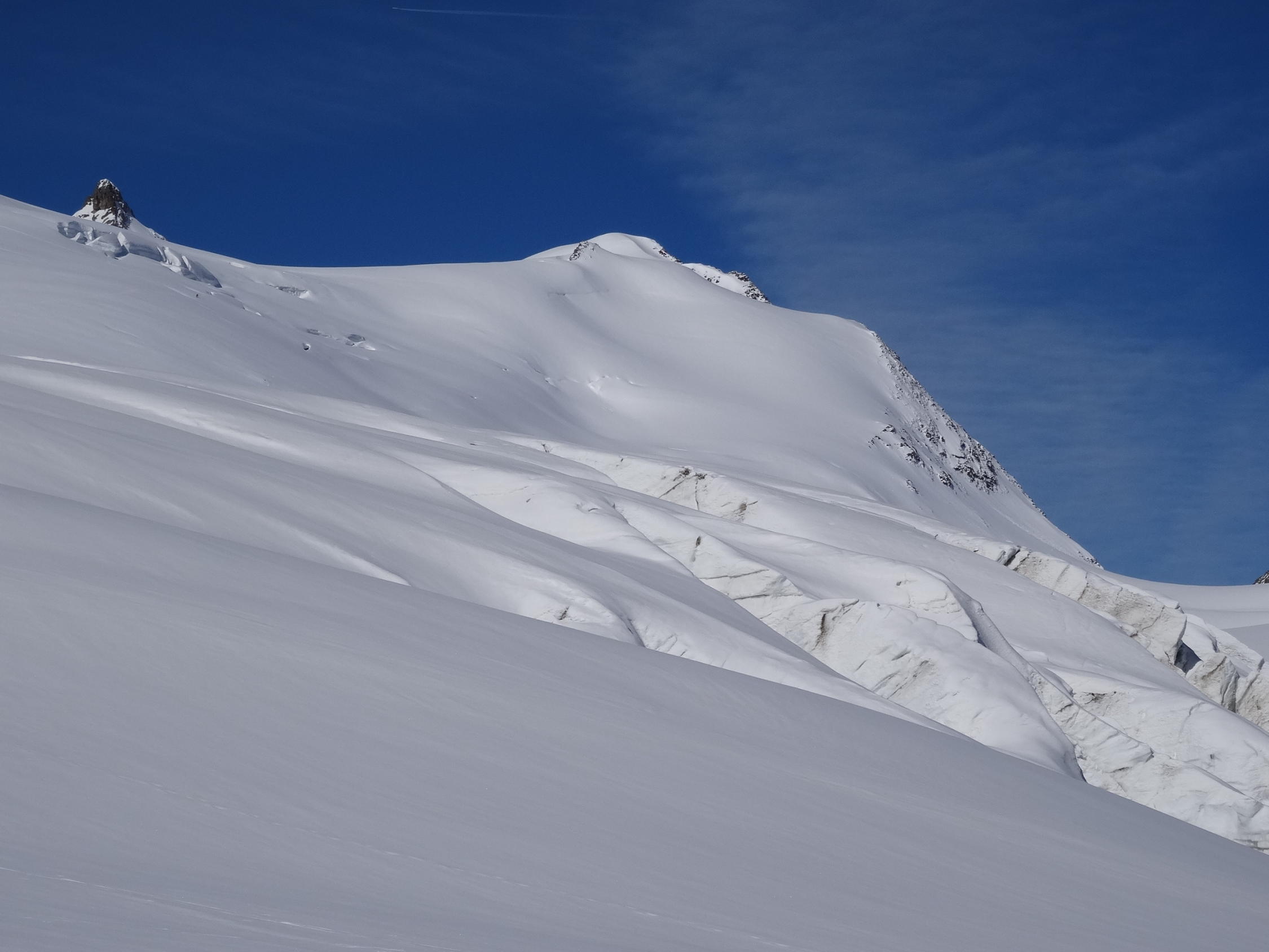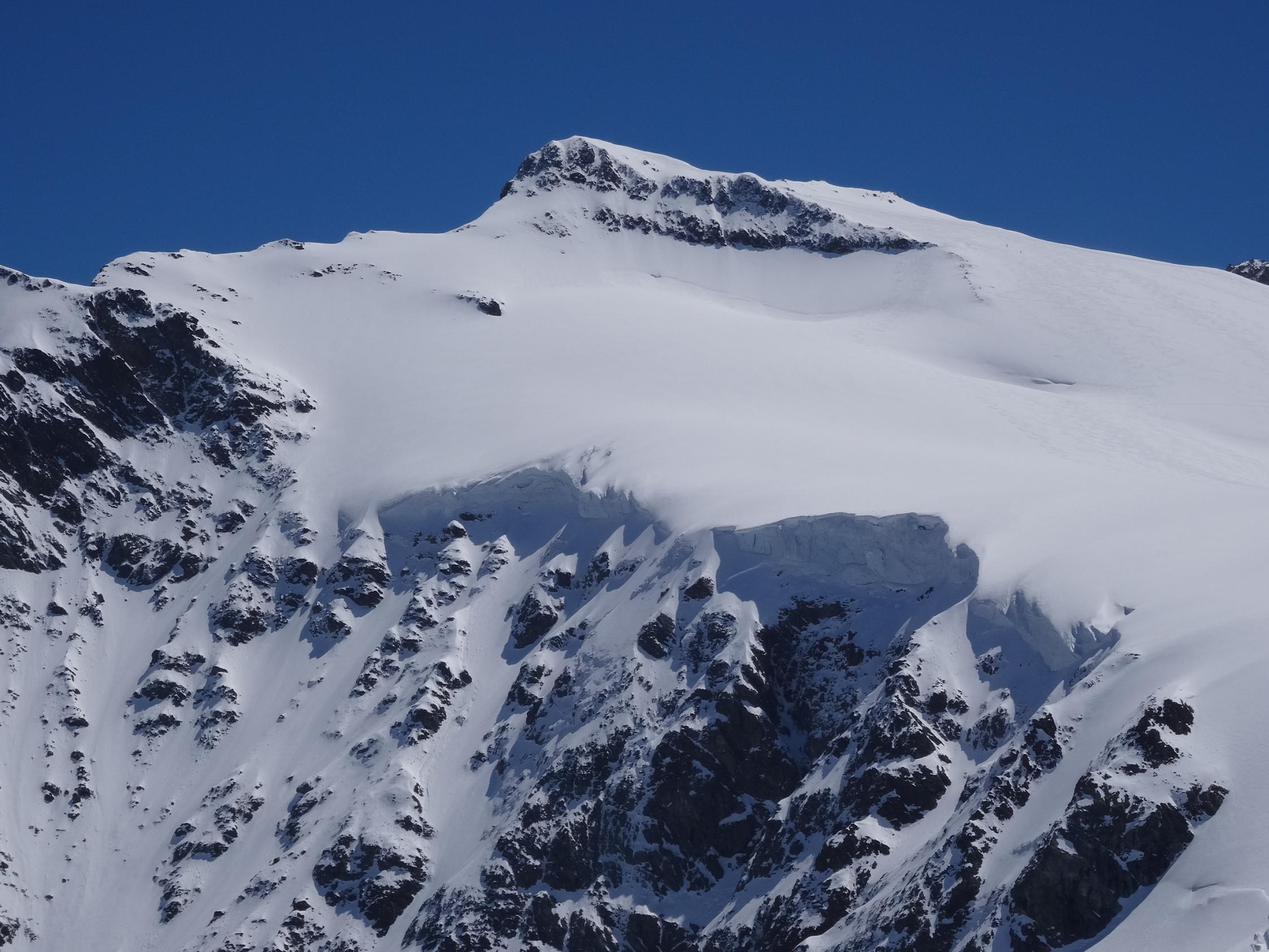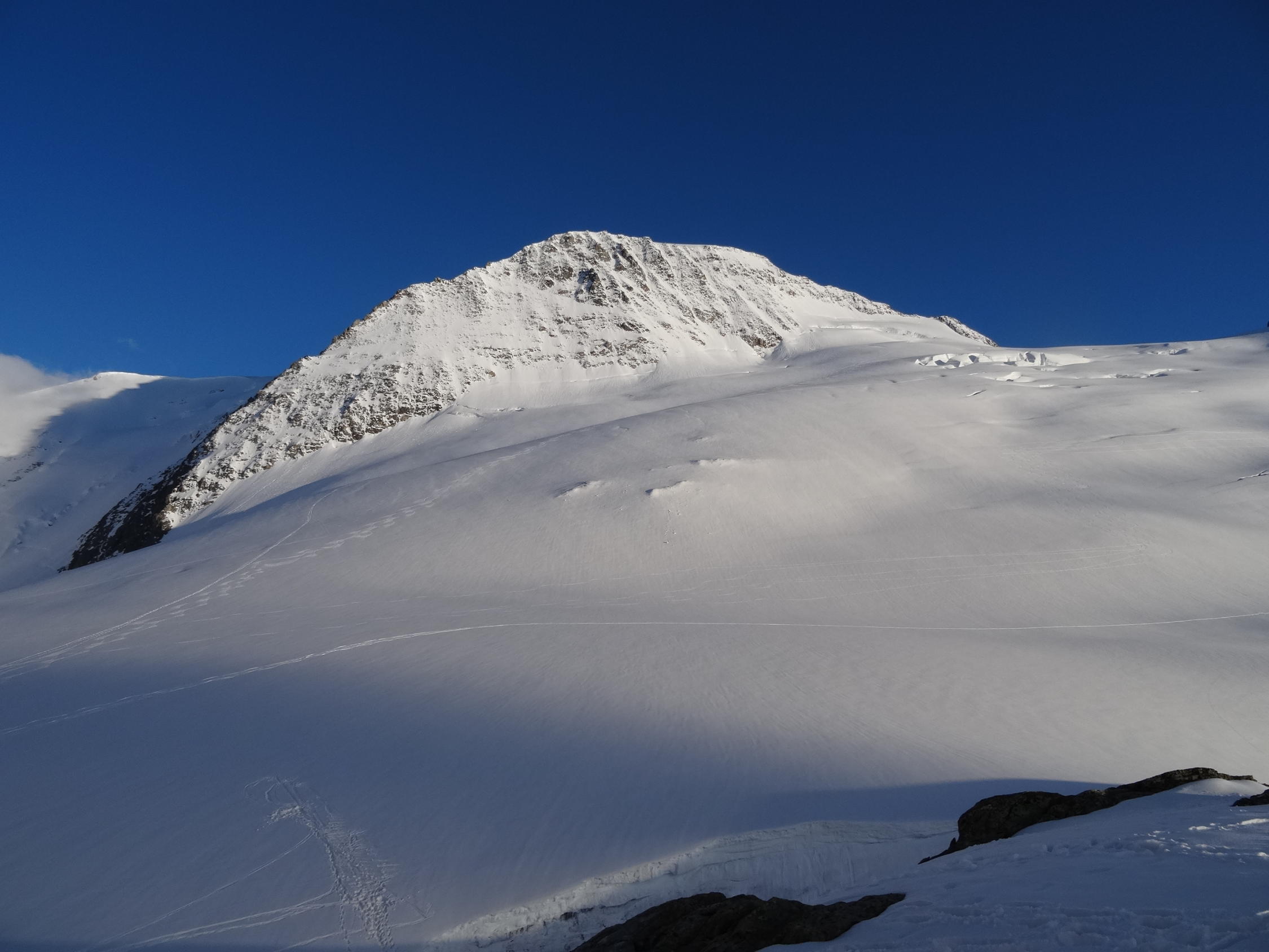 Schnee ab Parkplatz Umpol. Am frühen Morgen harte Decke. Aufstieg ohne Harscheisen gut machbar. Durchgehende Aufstiegsspuren. Gletscher noch gut eingeschneit. Spaltenzonen können weitgehend umgangen werden.