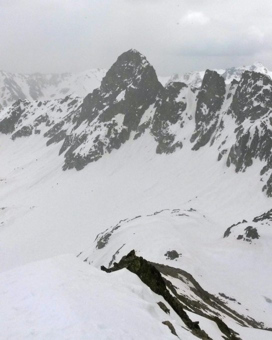 beste Tourenverhältnisse frühmorgens nach klarer Nacht; im Couloir Trittfirn, der aber wegen der ausgeprägten E-Exposition rasch weicher wurde; schon im späteren Vormittag Aufzug einer hohen Bewölkung und sogar leichter Schneefall, aber immer auch wieder Aufhellungen.