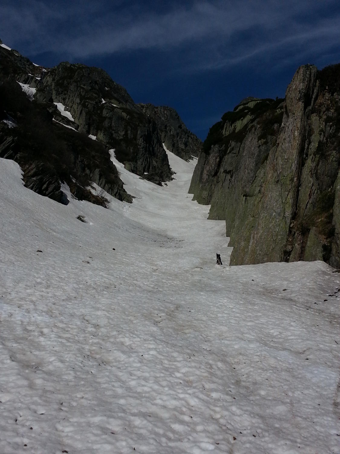 Schnee am Juchlistock (nordseitig) noch schön hart, super zu fahren. In der Rinne selbst schon ziemlich weich, aber Schnee hat es noch genug.