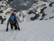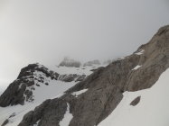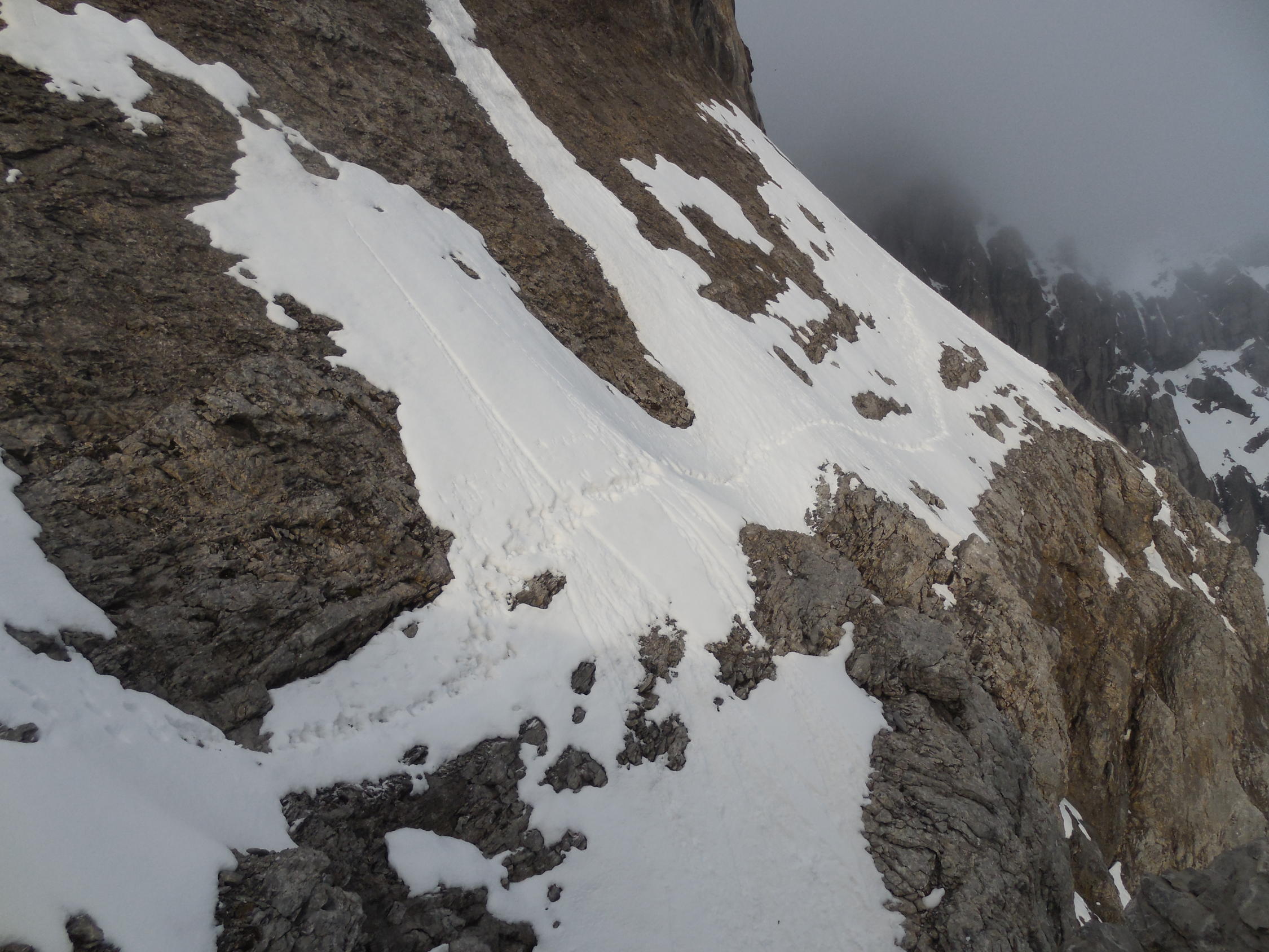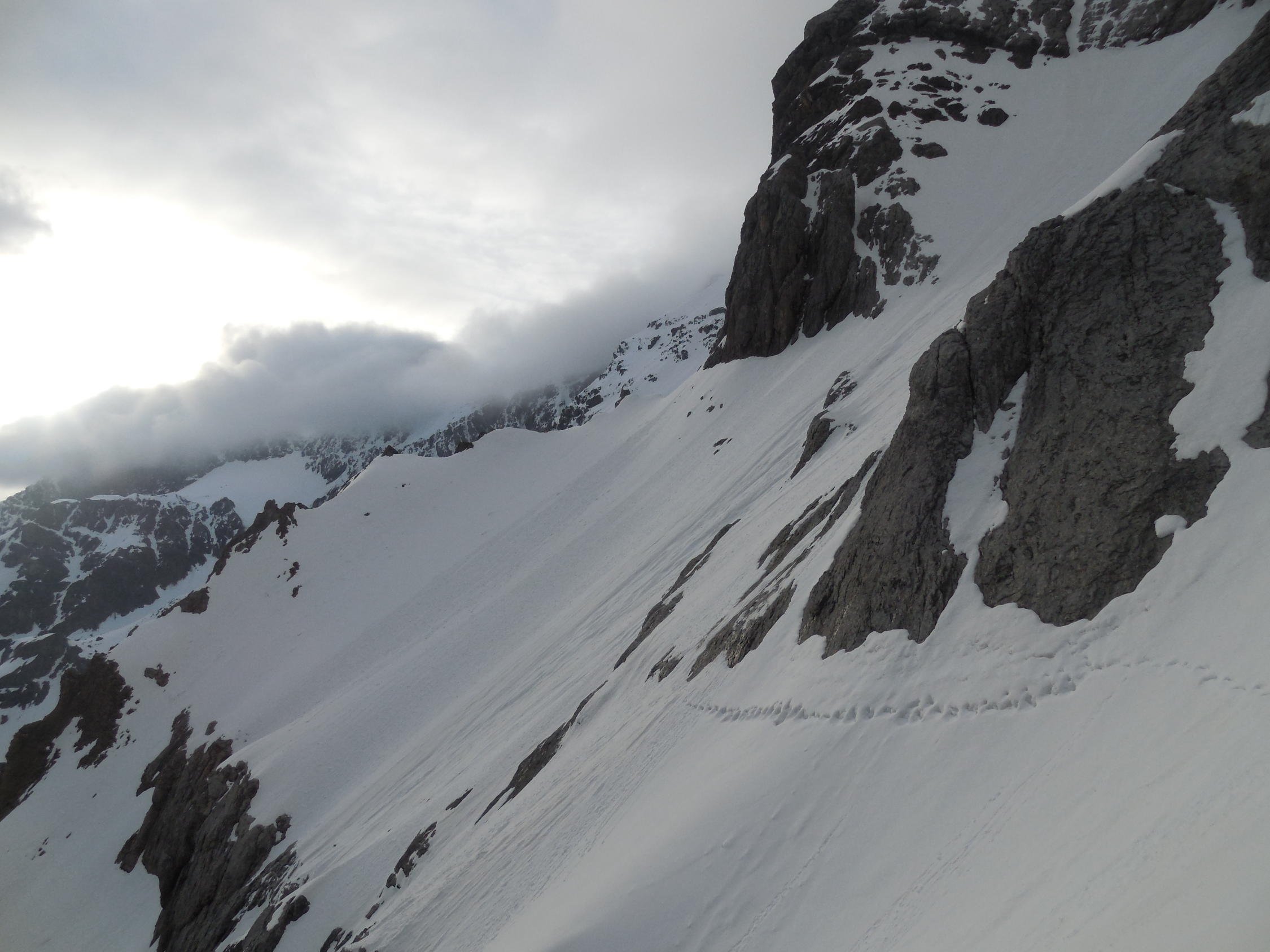 Anfahrt am Vorabend durch monsunartigen Regen in Urnerboden, in der Nacht Aufklarung, aber nicht lange genug klar für einen ordentlichen Harschdeckel. Der Gipfel war fast ständig in immer ernsteren Wolken gehüllt. Die Wand selber ist aber sehr gut eingeschneit, auch die Abfahrt ist bis zum Auto ohne Ausziehen der Skier möglich. Die Querung jedoch weist sehr bald erste Felspassagen auf.