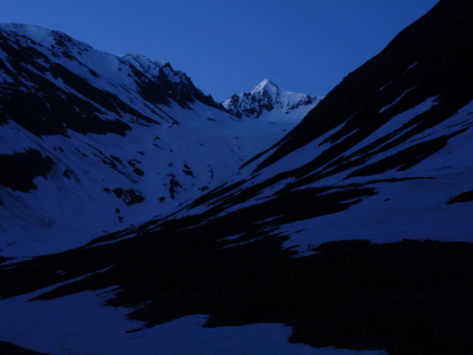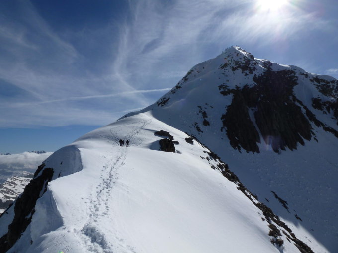 Schnee: top Frühlingsverhältnisse, im Aufstieg hart und griffig, in der Abfahrt leicht aufgesulzt. Ab Skidepot (ca. 2940m) viele ältere Nassschneerutsche, so dass es nicht wirklich lohnend war die Skis auf den Grat hochzutragen. Mit Ausnahme von zwei kurzen (wenige Meter) Tragestellen noch Schnee bis zum Auto.