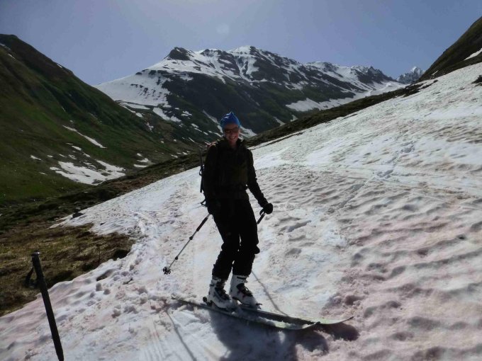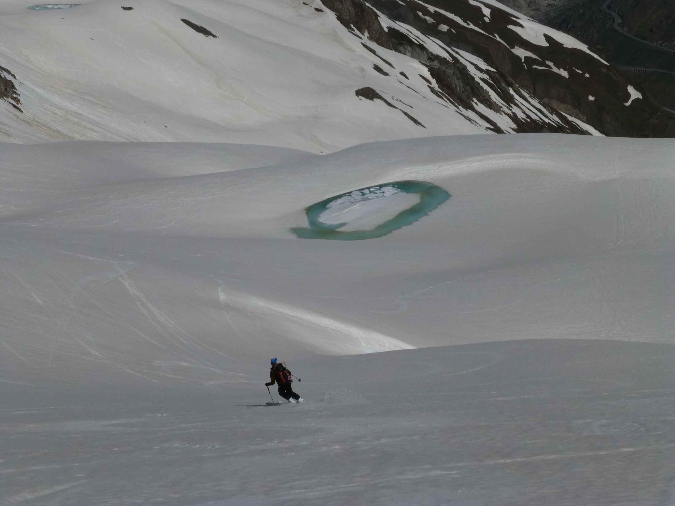 Bei der Abfahrt um 9:30 Uhr war der obere Teil schön aufgefirnt, unten jedoch schon recht schwerer Schnee.