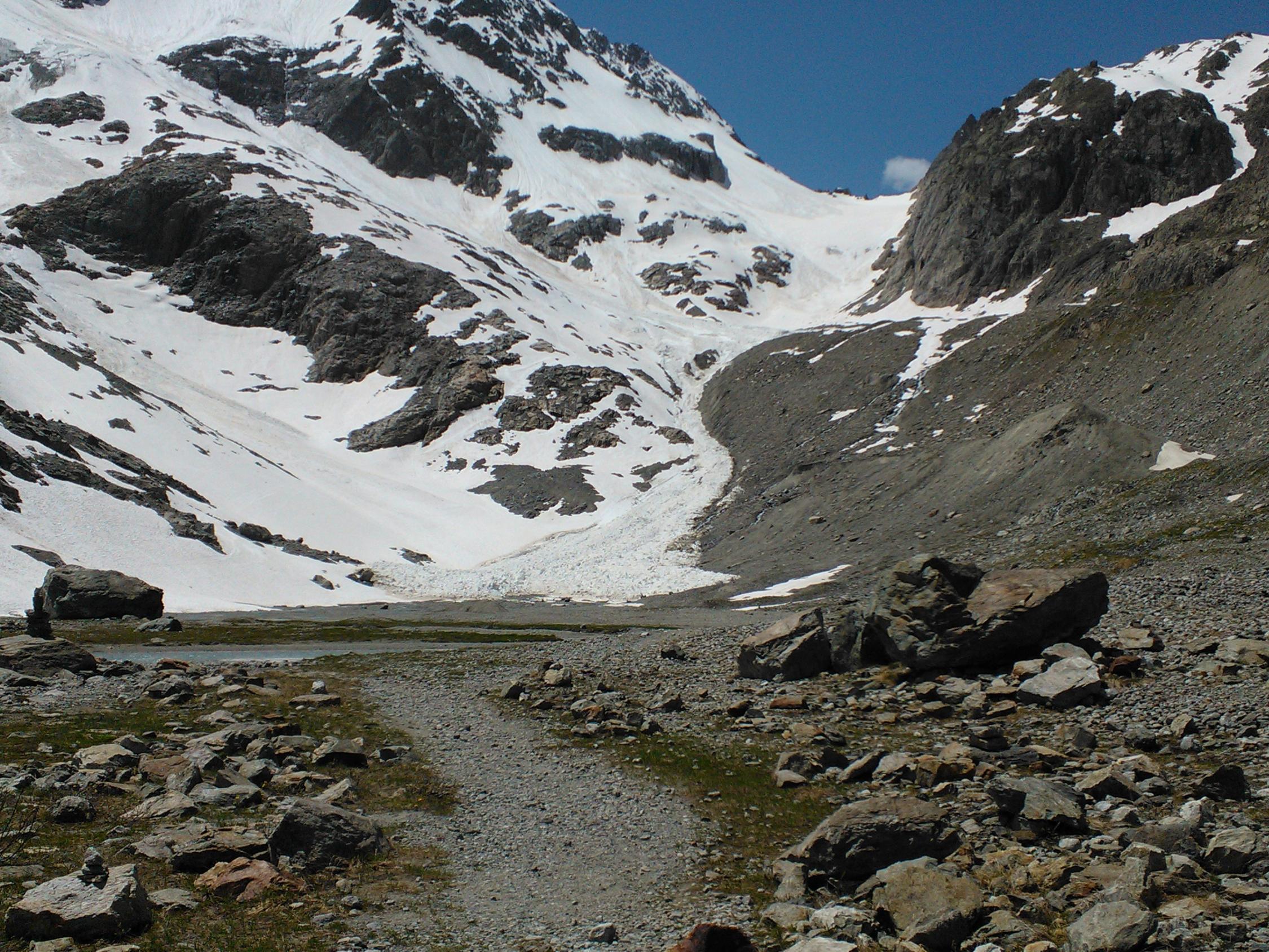 Ein Riesen-Schneebrett von der Nordwand des Vorder Tierberg hat die Aufstiegsroute zum Giglistock verschüttet. Dort ist Saisonende. Generell in allen steilen Expositionen Schneebretter wegen der Hitze.