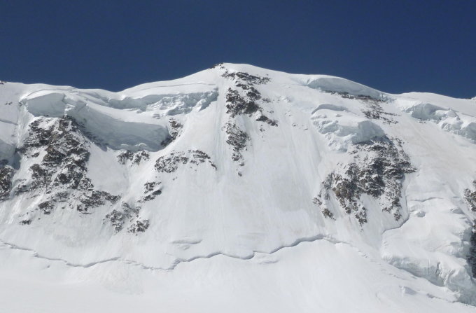 Querung mehr oder weniger poröser Lawinenschnee auf mehr oder weniger konsistentem Blankeis, etwas heikel. Wir haben hier 1,5 Seillängen gesichert, geht mit Eisschrauben gut. Danach einigermassen problemlos zum Hauptgipfel und ins Lisjoch abgestiegen. Von dort Abfahrt über den Grenzgletscher, sehr spaltenreich. Sobald der Gletscher flach wird, muss bis Rotenboden getragen werden.
