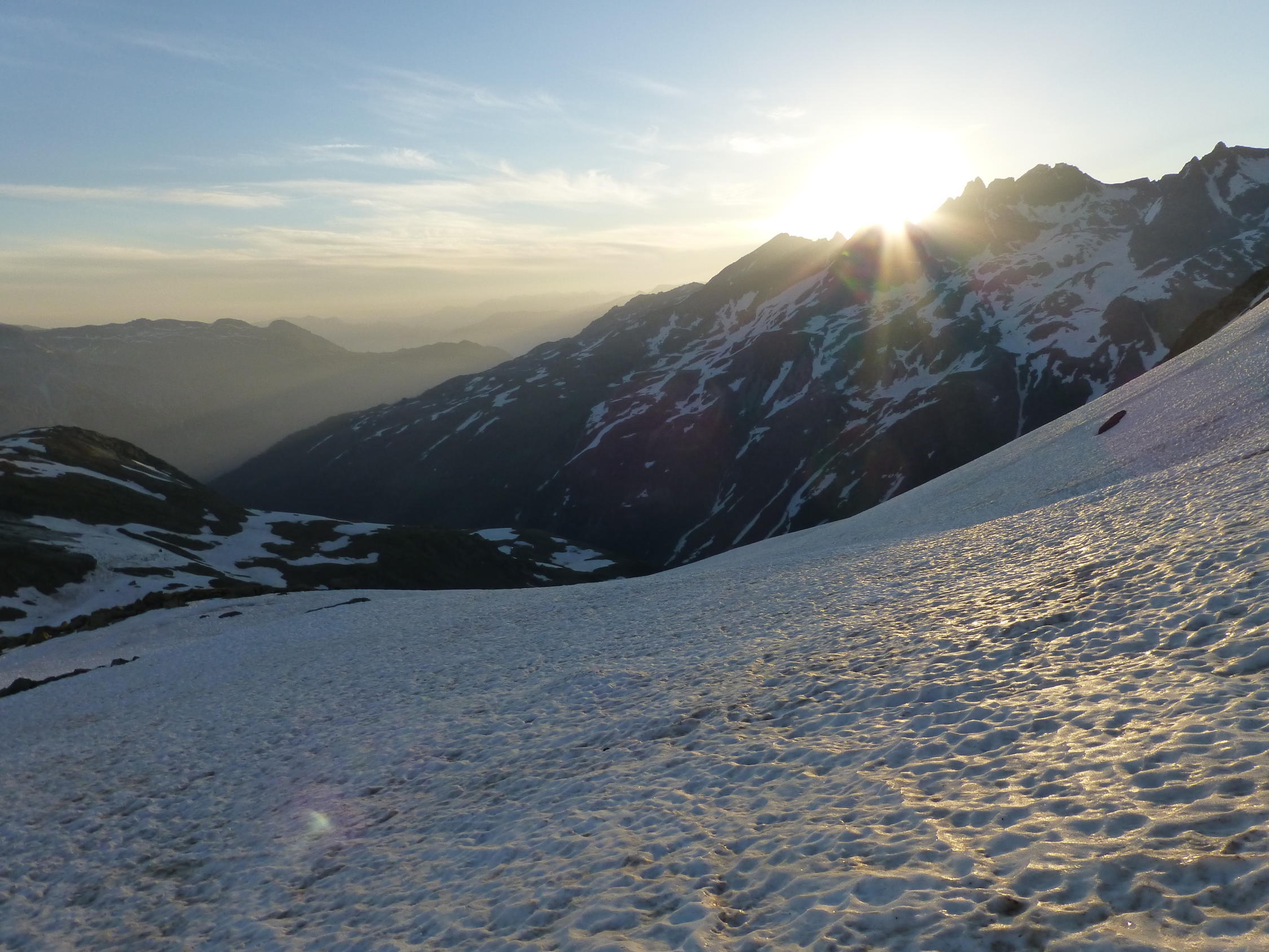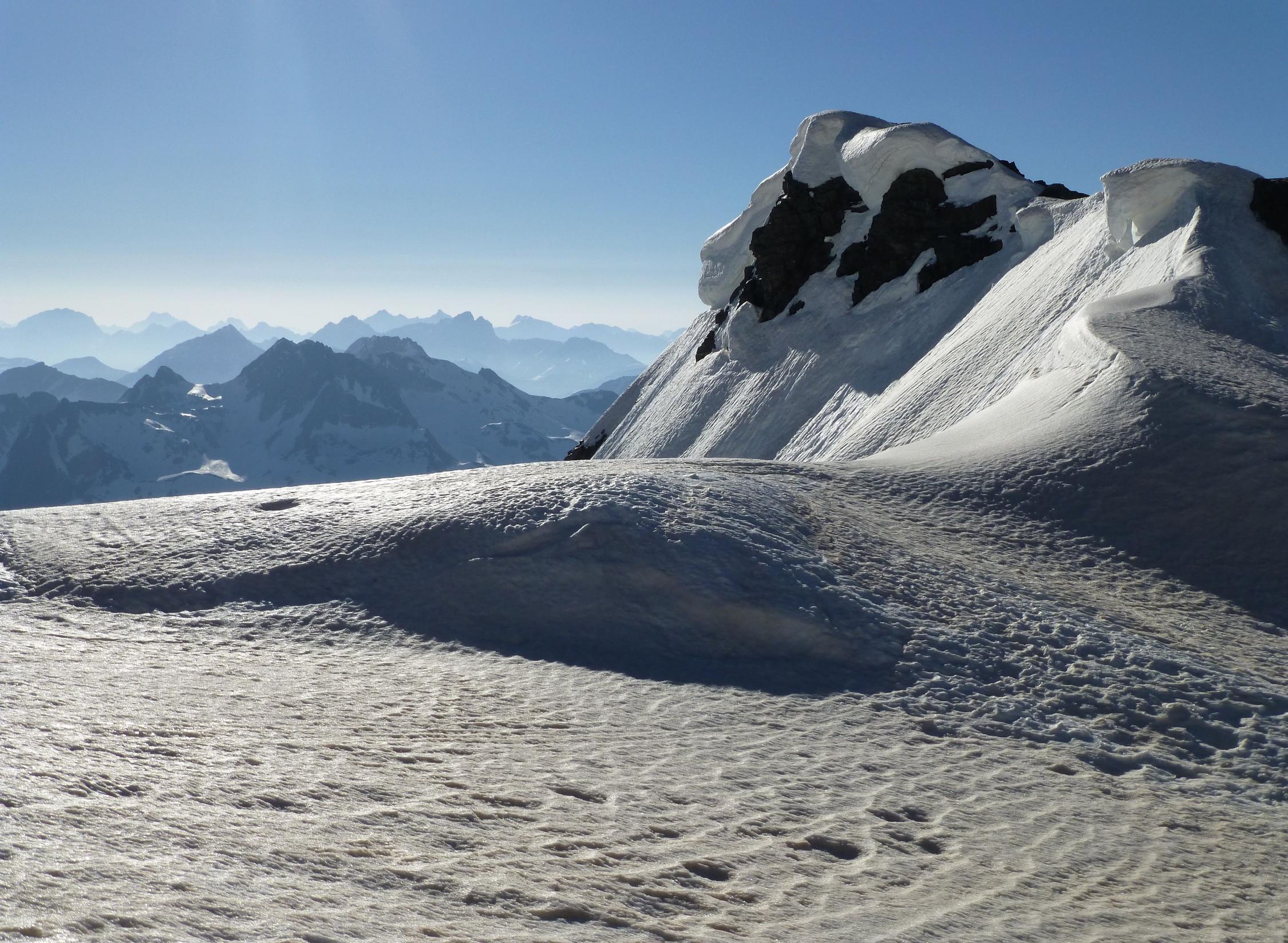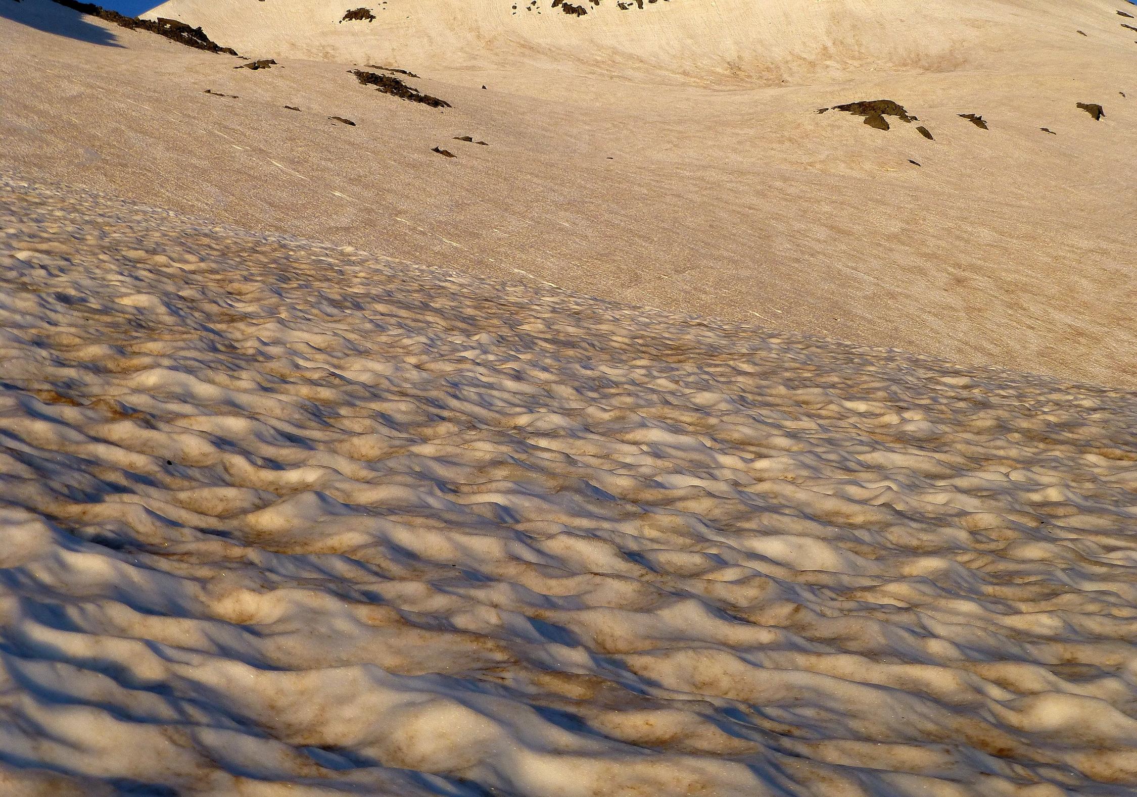 Im Aufstieg zum Lattenhorn-Sattel Wüstenlandschaft im engeren Sinne. Saharastaub hat den Schnee braun eingefärbt (siehe Foto). Verstärkt wird der Wüsten-Effekt durch die Waschbrett-Struktur an der Oberfläche. In diesem Ausmass habe ich dieses Phänomen noch nie beobachtet.