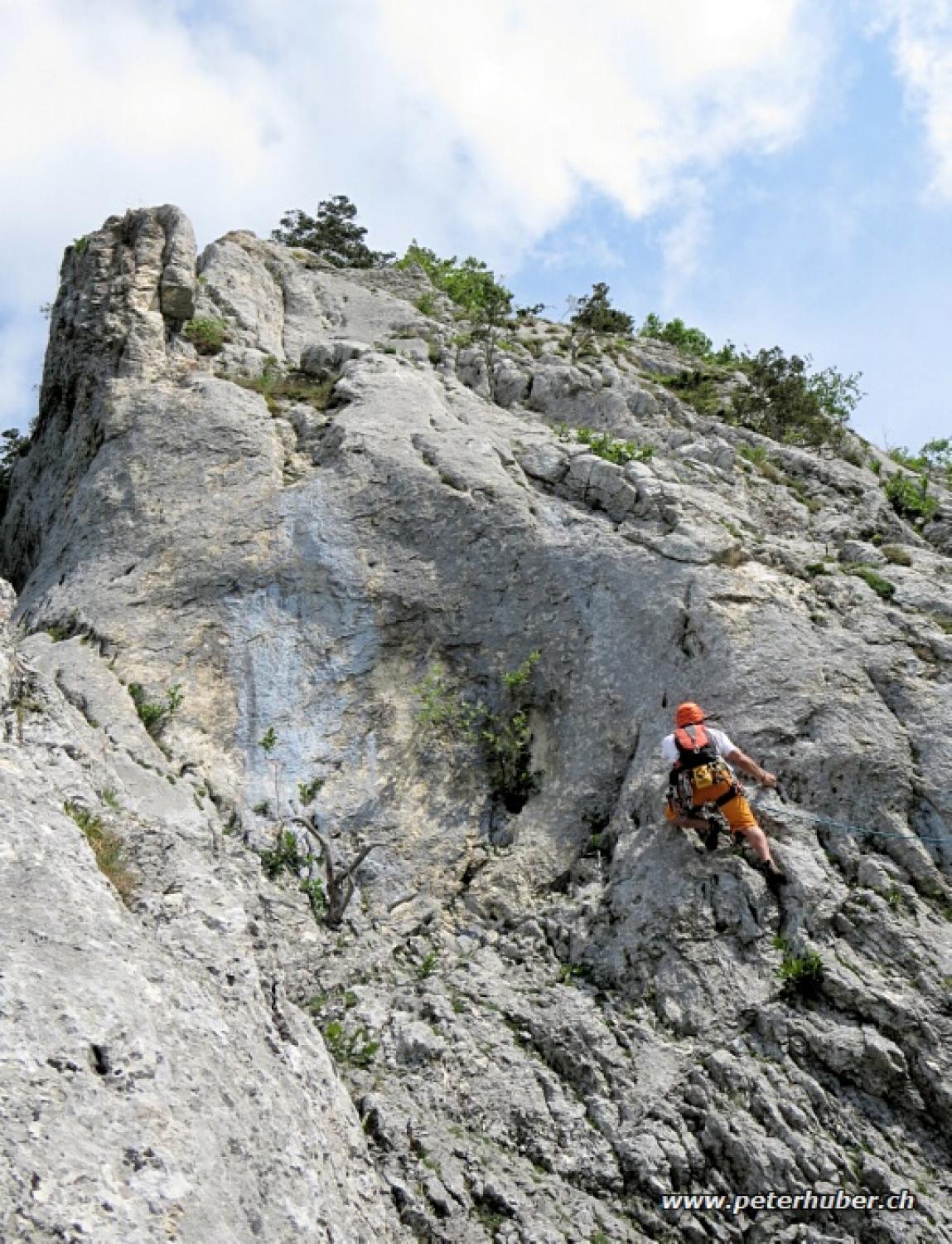 Meist schön, gelegentlich etwas Wolken. In den Felsen kam die Bise nicht dazu und daher angenehm warm. Der Fels war trocken und fest. Alle Bohrhaken und Stände in gutem Zustand.