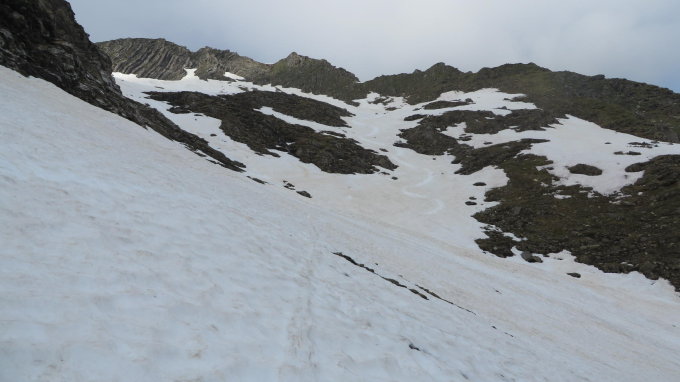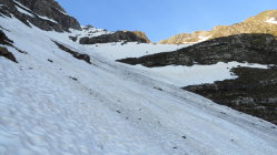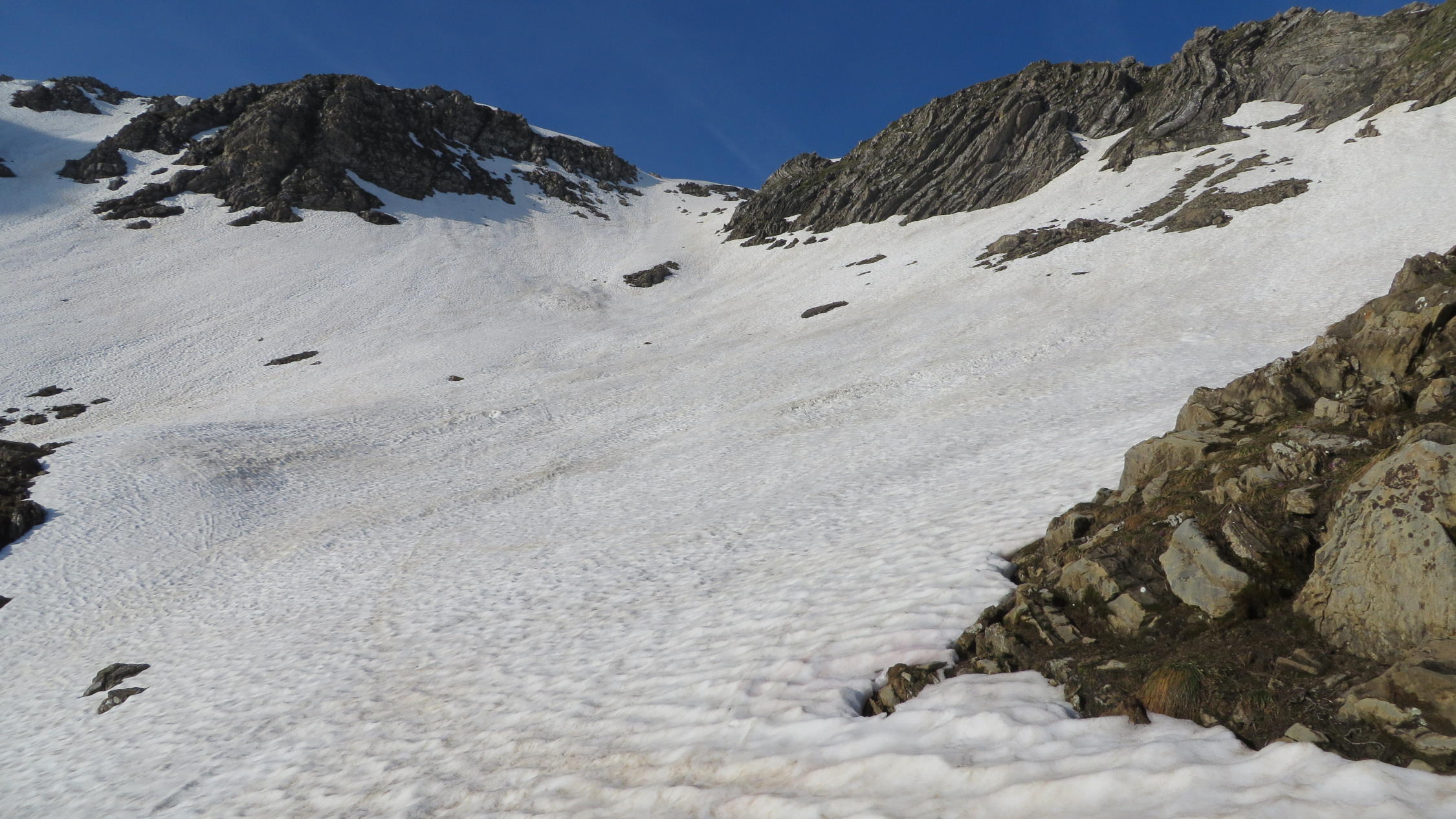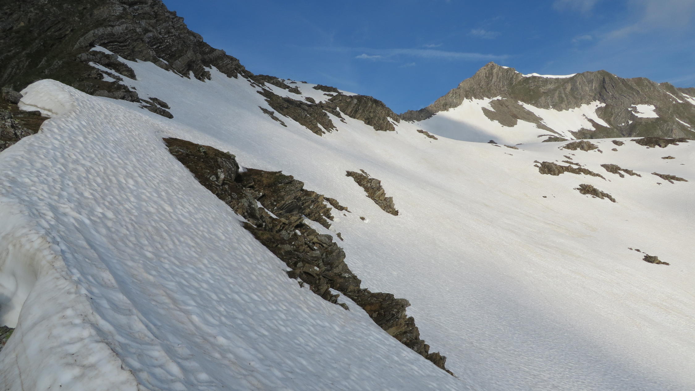 Aufstieg und Abfahrt leicht aufgesulzt und leicht gewellt aber überraschend gut zum fahren.Zum teil hat es von den zahlreichen Lawinen des Winters ein bisschen dreck und ist Steine gespickt.