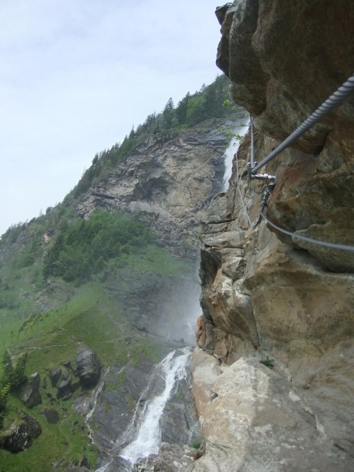 Anspruchsvoller Sport-KS, der ausgesetzt zum Nahbereich des Wasserfalls führt und an Kulisse nichts zu wünschen läßt. Jedoch über kaum Eisentritte und Stifte verfügt, so daß kontinuierlich Armkraft gefordert ist. Kletterschuhe mit guter Reibungssohle sind von Vorteil. Ungeeignet für Beginner und Kinder.