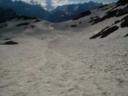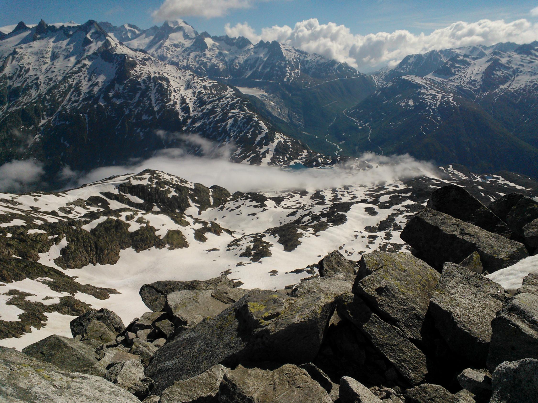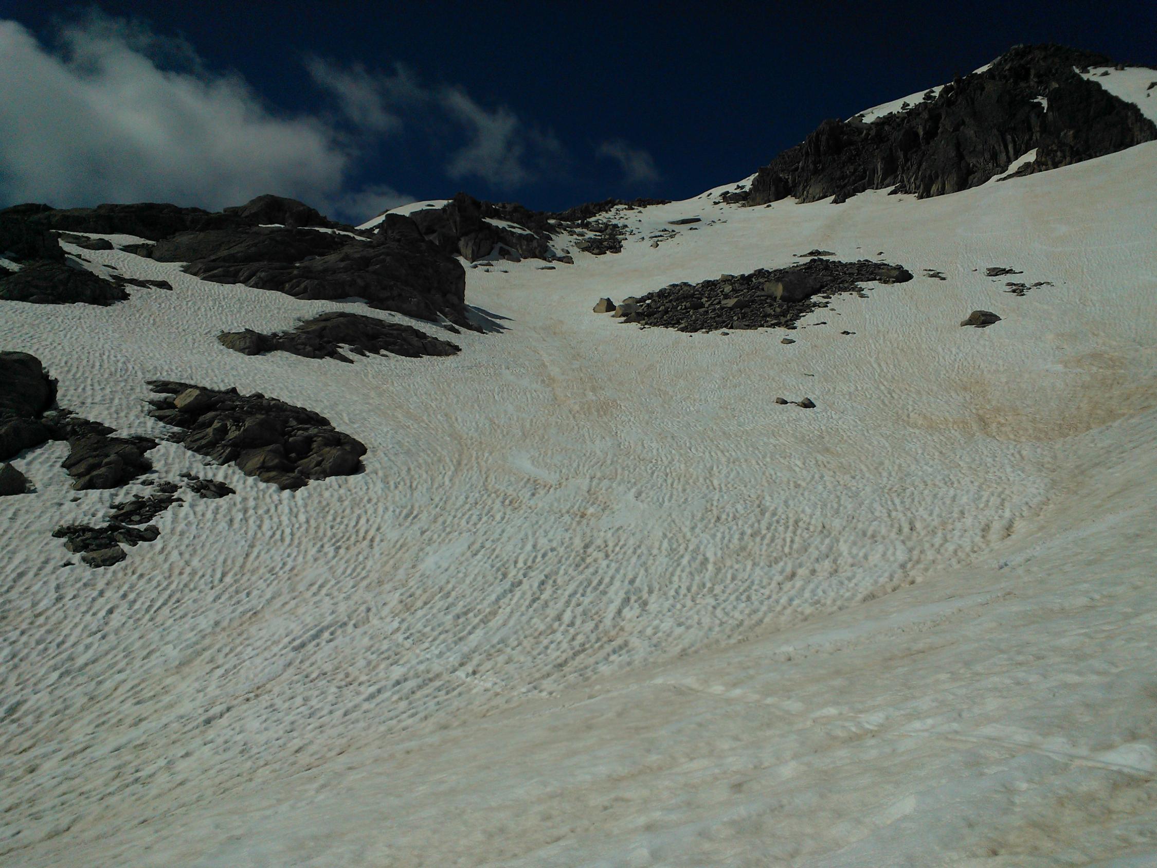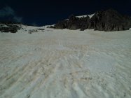 Der Schnee ist in der Hitzeperiode letzte Woche erheblich geschwunden, etwa 1 Meter oben am Gipfel - aber immer noch kann man 50 Meter nach dem Parkplatz anfellen! Im Aufstieg ist im unteren Teil des ersten Coulis teilweise der Bach durchgebrochen, da muss man kurz tragen. Sonst unverändert gute Verhältnisse, griffiger Schnee auch im Steilhang zum Gipfelgrat, wobei hier die Harscheisen sehr sinnvoll waren. Schöne und warme Gipfelrast, im Süden wie vorhergesagt viele Wolken, im Norden schön. Die Abfahrt zum Triebtensewli mit Wiederaufstieg, die ich - wie letztmals vor 10 Tagen, als ich auf dem Sidelhorn war - machen wollte, um die schönen Hänge geniessen zu können und die Höhenmeter auf 1000 steigern zu können, ging allerdings nicht mehr. Die Hänge sind jetzt teils schneefrei (vor allem oben am Einstieg), und dort wo es Schnee hat, ist es hartgefrorener Büsserschnee statt Firn. Kein Genuss. Also blieb es bei der Normalabfahrt zum Pass, diese war in den sonnigen Hängen sehr schön, da der Büsserschnee aufgeweicht und somit gut zu fahren war. Bin gefahren bis zum Auto!