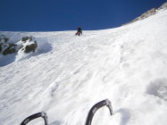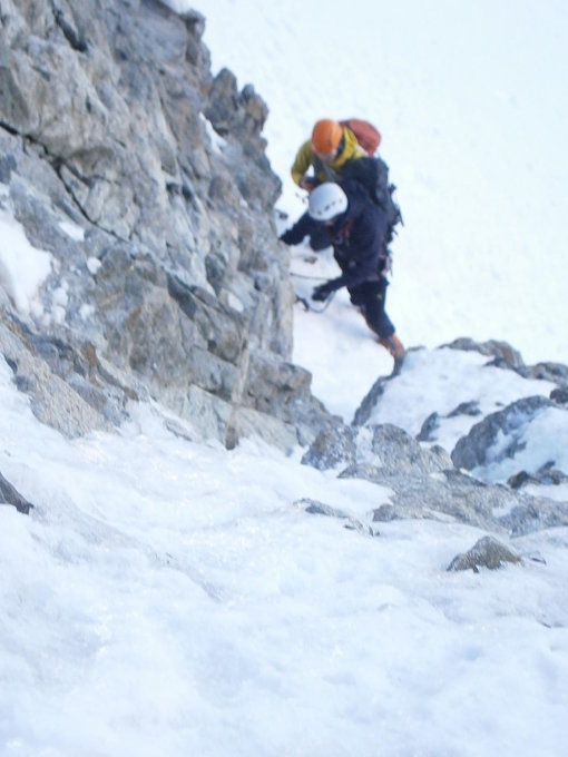 Brauchten nicht zu sichern. Der Felsriegel hatte genug Eis bei seiner Querung. Solange es kalt bleibt, ist es gut. Die Sonne scheint bereits ab 06.00 Uhr in die obere Wand, ab 07.00 Uhr in den Felsriegel. Bis spätestens 08.00 Uhr sollte man den Felsriegel hinter sich haben, um Eis und nicht Schneematsch vorzufinden. Blankeis war lediglich im oberen Wanddrittel auf ca. 40 m.