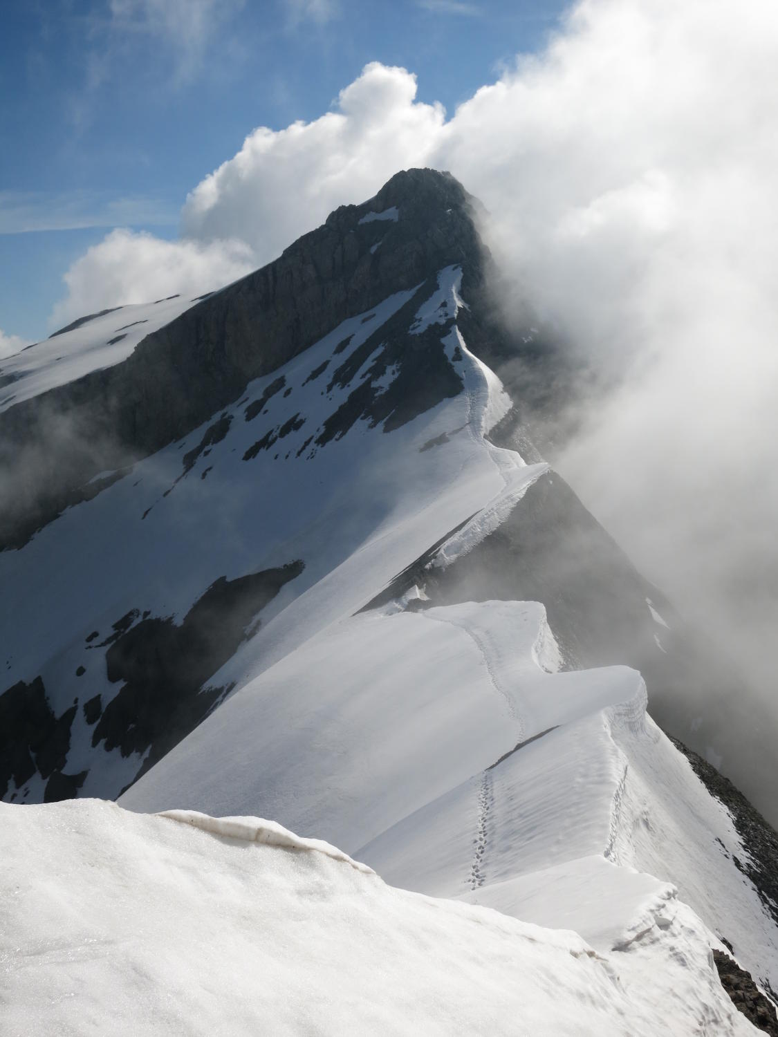 Felsstufe am Schwander Grat und Gipfelfelsen trocken, im Verbindungsgrat schöner Firn.
