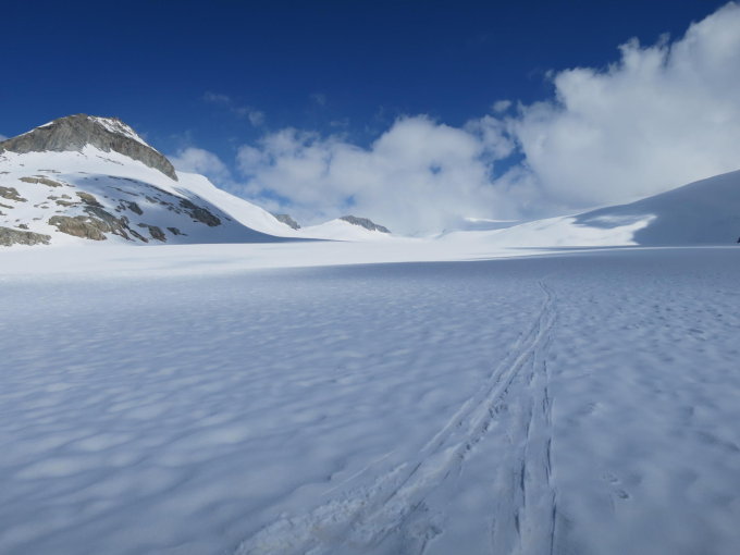 Skis bei der Eisgrotte angeschnallt. Bis zum ersten Bruch war der Untere Rhonegletscher blank, von dort durchgehende, tragende Schneedecke. Auf dem Grossfirn lagen 5-10cm Neuschnee. Unterhalb des Eggstocks kam Nebel auf, der sich hartnäckig am Winterberggrat festkrallte. Ab und zu gab er trotzdem einen vagen Blick auf die Walliser oder Urnerseite frei. Mit den Skis bis wenige Meter unter das Dammastock Gipfelkreuz. In der Abfahrt der Aufstiegsspur entlang an den Fuss des Eggstocks der noch voll im Nebel lag. Über den Egg und Grossfirn auf pulvrigem Neuschnee zum grossen Rhonegletscher Plateau hinab. Auch über die grosse Ebene ging es ganz flott dahin. Unter der Seraczone konnte man noch ein kleines Stück auf einem "sandigen" Schneeband abfahren. Über eine felsige Steilstufe, nahe an der Moräne die Skis ca. 15 Min. getragen, dann über den blanken Gletscher zur Eisgrotte zurück. (Eine ziemlich rasante Angelegenheit!)