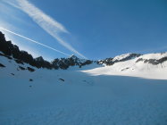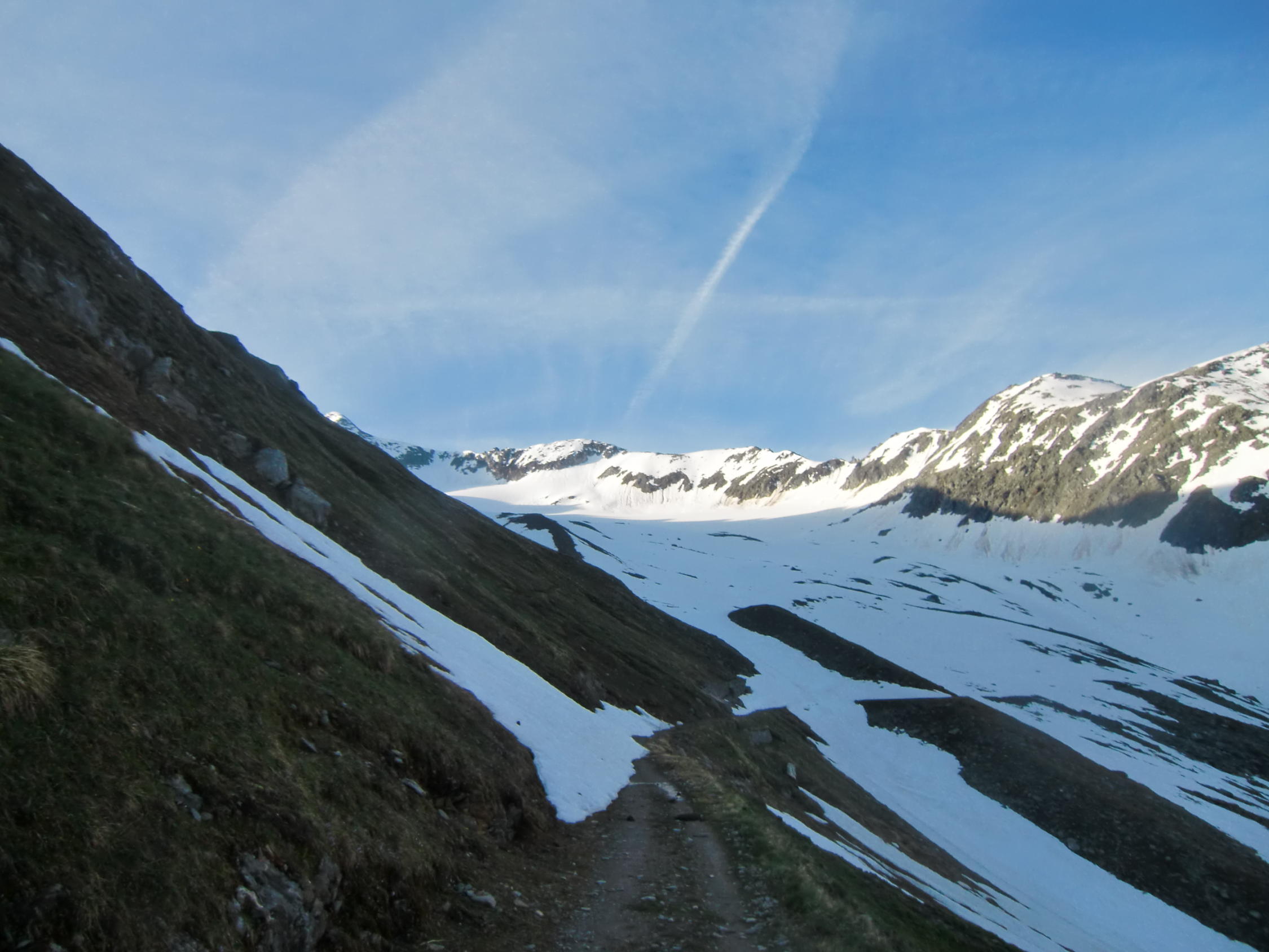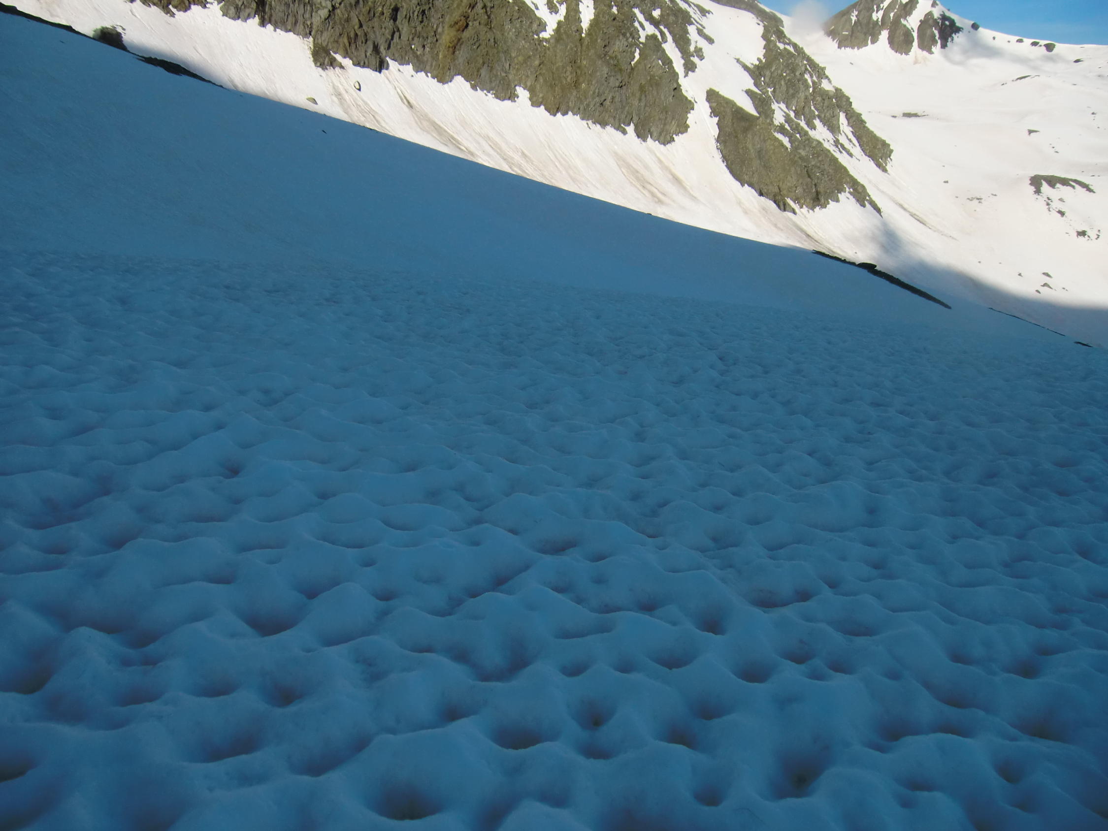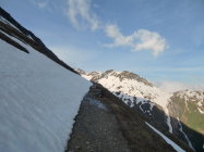 Militärstrasse praktisch schneefrei, ausser die ersten ca. 200m, dort kommt man aber seitlich gut ohne schneekontakt durch. Ab Moräne durchgehend Schnee bis Gipfel. Schneeoberfläche bis ca. 2800m gleicht jedoch einem Waschbrett!