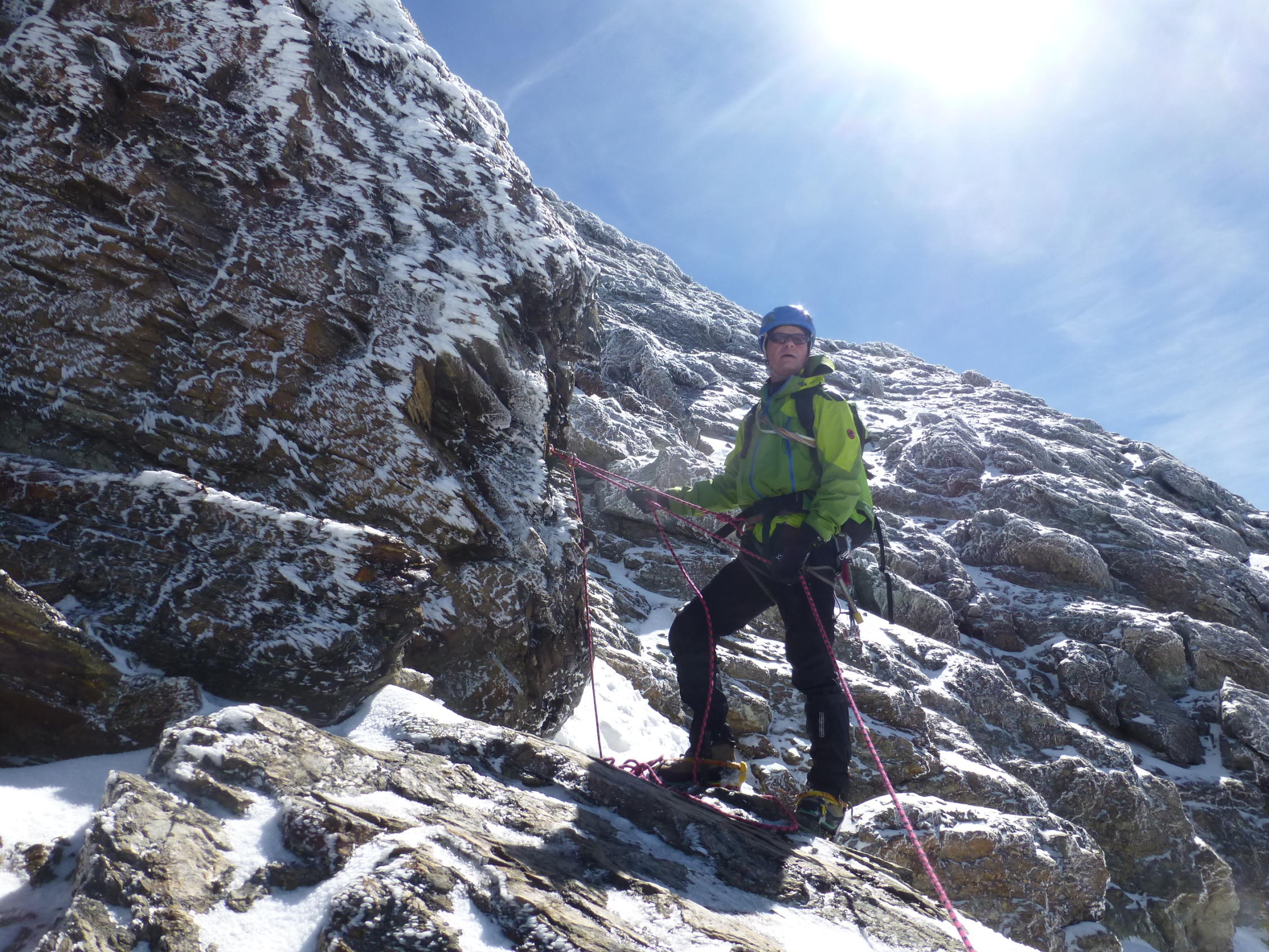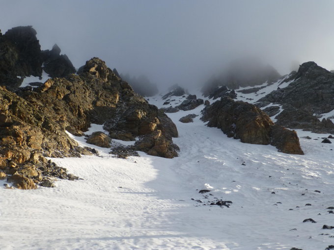 Noch viel Schnee in der Weilenmannrinne, leider noch nicht so gut gesetzt. Heute waren die Gipfelfelsen vereist, dank der Kaltfront.