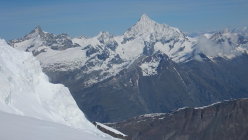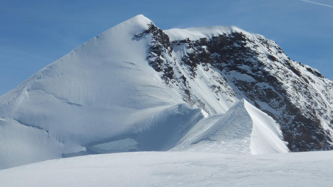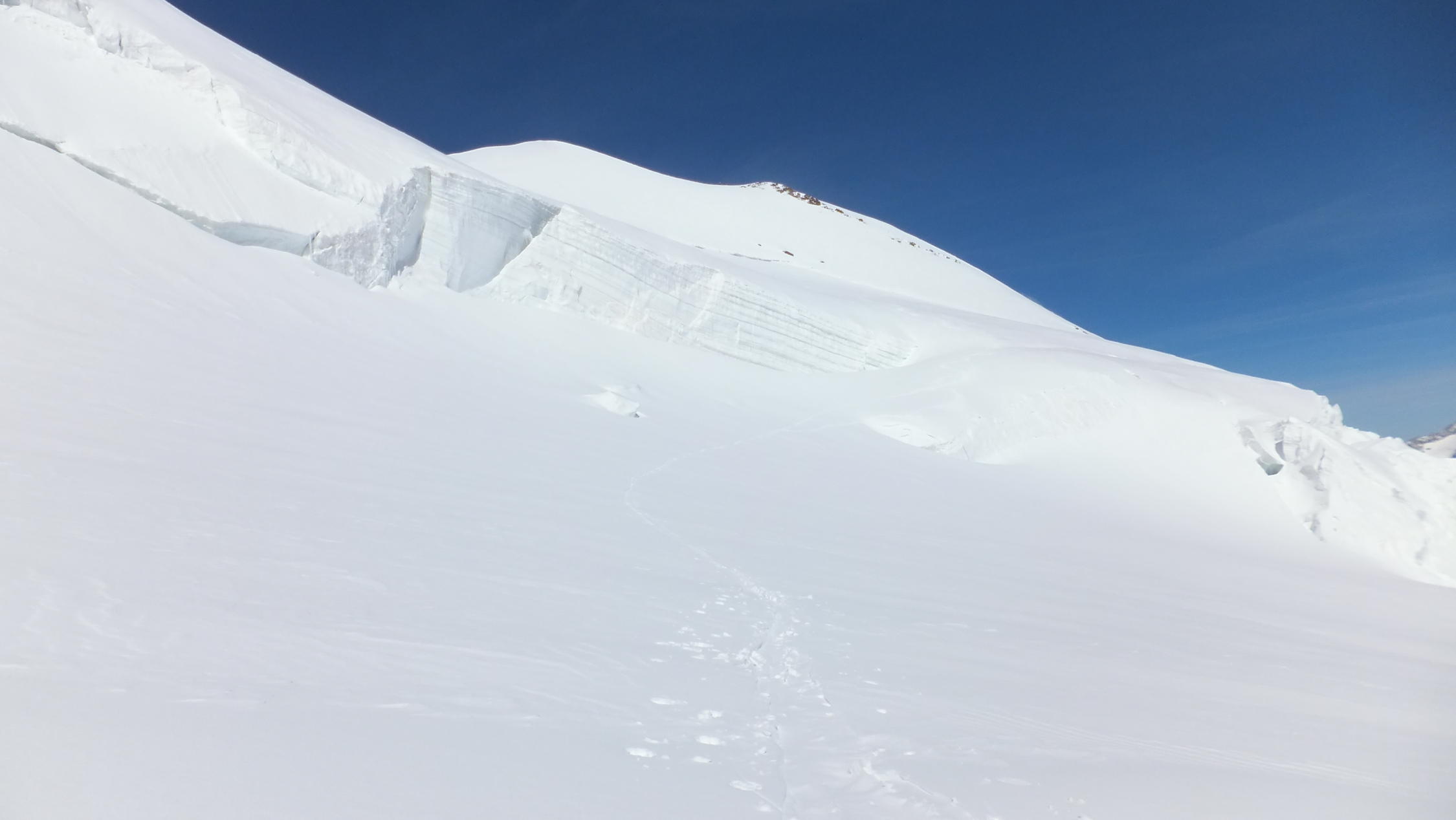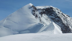 Statt dessen, Abfahrt bis kurz vor die Sellahütte und Traverse über den Schneedompass zum östlichen Lisgletscher. Aufstieg zum Joch P4250 und Abfahrt über den Grenzgletscher zur Monte Rosa Hütte.
