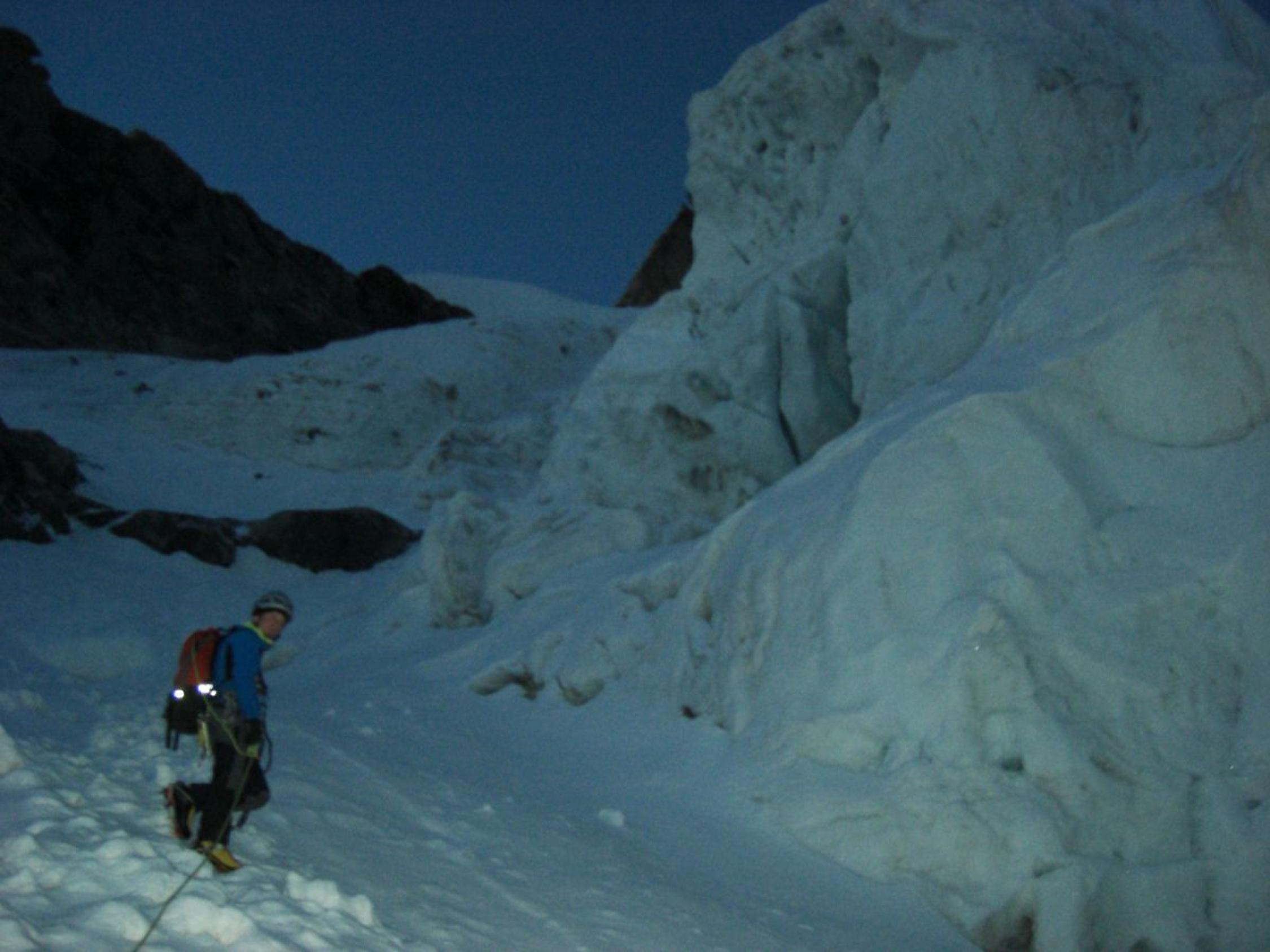 Wir sind in gutem Trittfirn die klassiche eisschlaggefährdete Einstiegsrinne hoch. Nach knapp 20 min waren ganz links in den Felsen und somit aus dem Eisschlagberiech draußen.