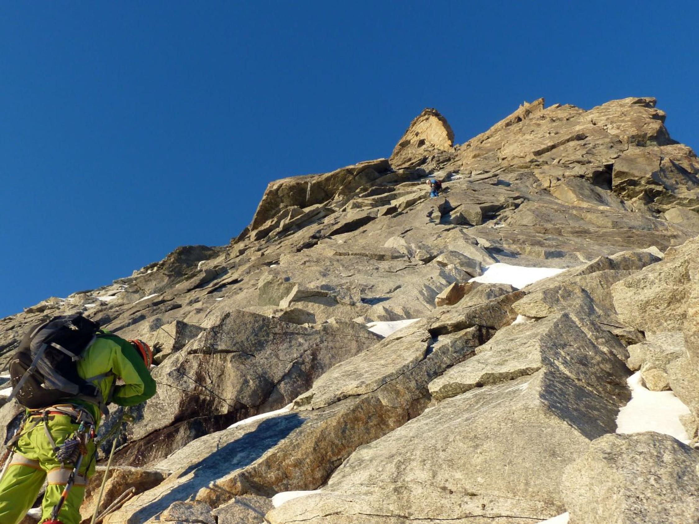 Im zentralen Felsteil Genussklettern in der Morgensonne. Zwar noch nicht gänzlich schneefrei aber alle entscheidenen Stellen trocken und schneefrei.