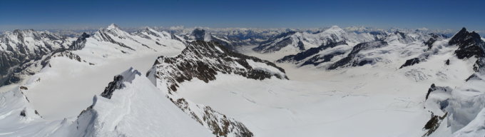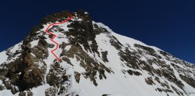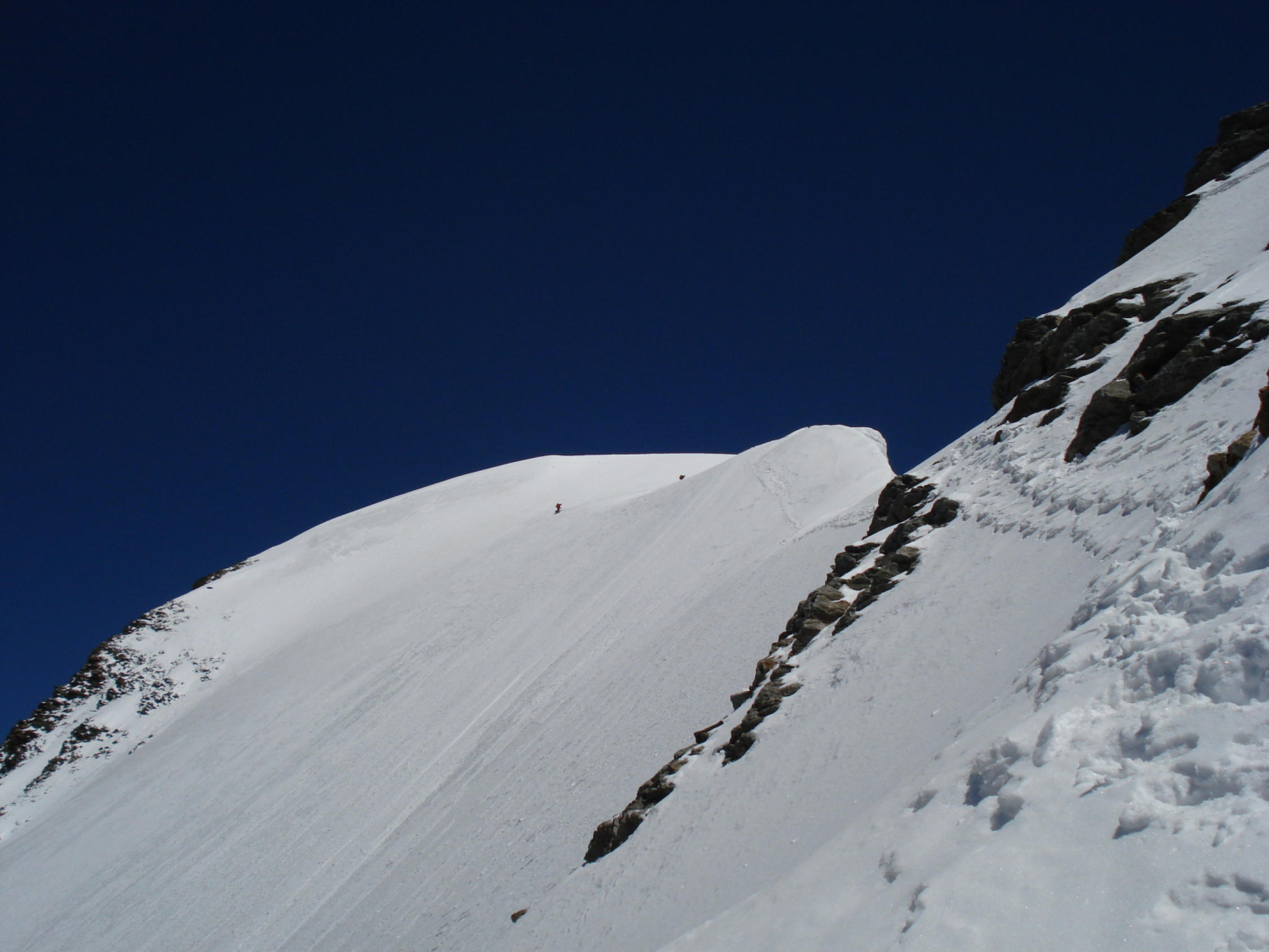 Firnflanke oberhalb P. 3811m mit gutem Trittschnee. Schlussgrat zum Gipfel mehrheitlich guter Trittschnee, auf ca. 30m kommt Blankeis zum Vorschein.