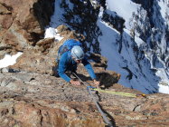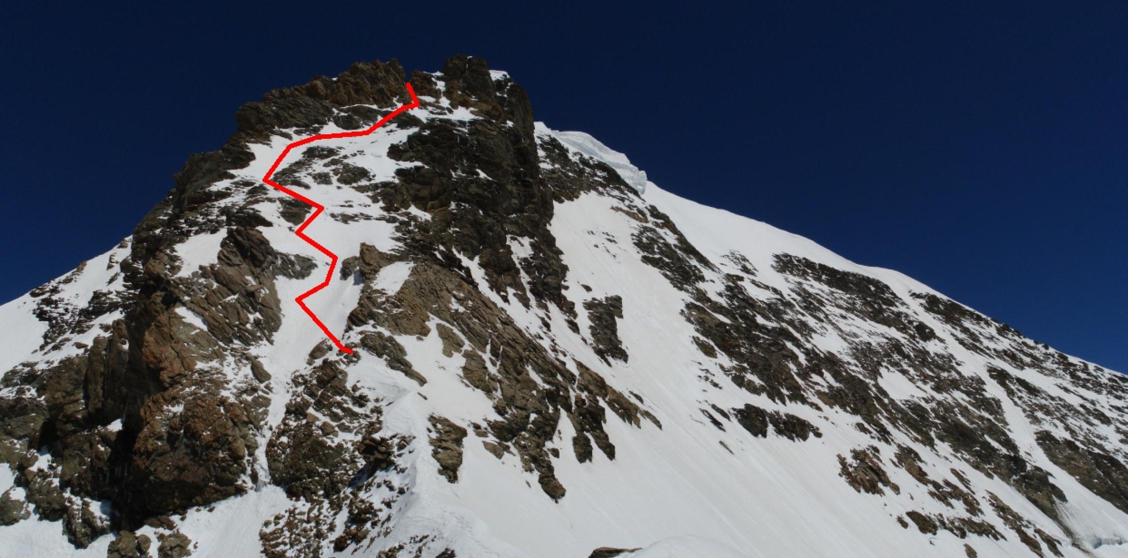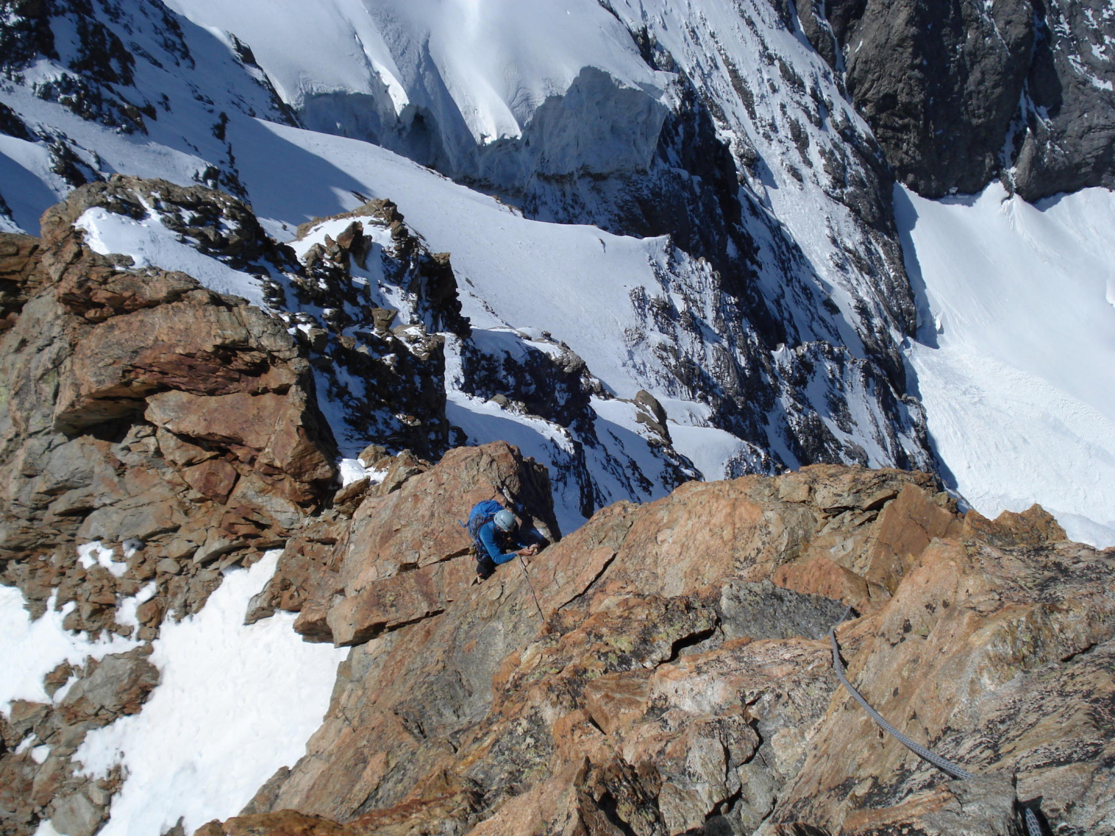 Nordseite noch verschneit; diese wird gleich nach dem Einsteigscouloir betreten. Danach bleibt man bis P. 3811m immer auf dem Grat, dort ist der Fels zur Zeit bis auf kleine Flecken schneefrei. Insbesondere ist die Schlüsselstelle trocken.