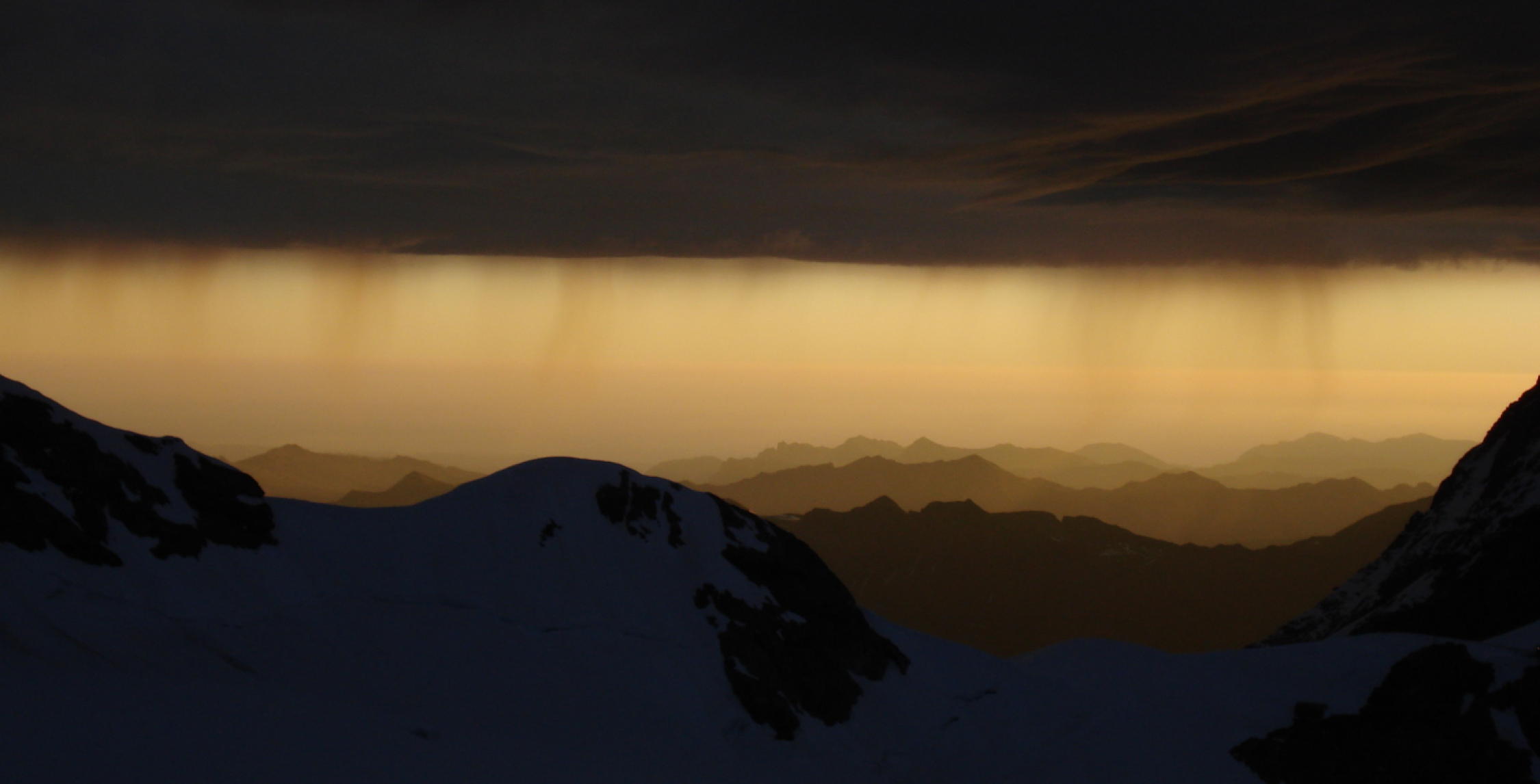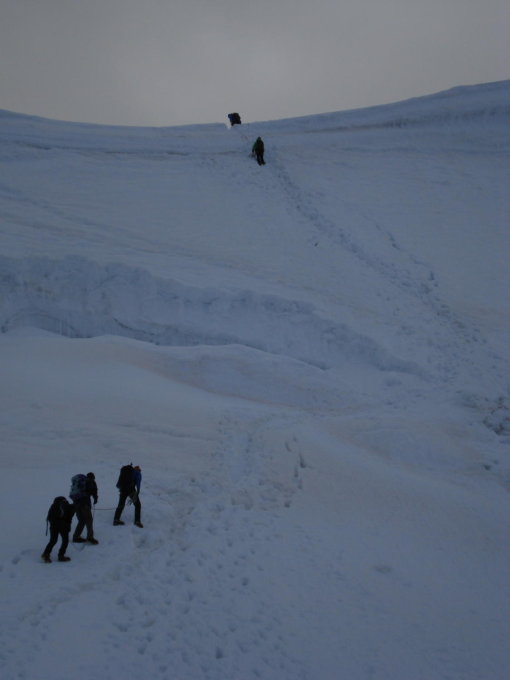 Felsen beim Regenmesser trocken, Bergschründe beim Regenmesser und unterhalb Rottalsattel gut eingeschneit, in Gipfelflanke und sonst überall guter Trittschnee.