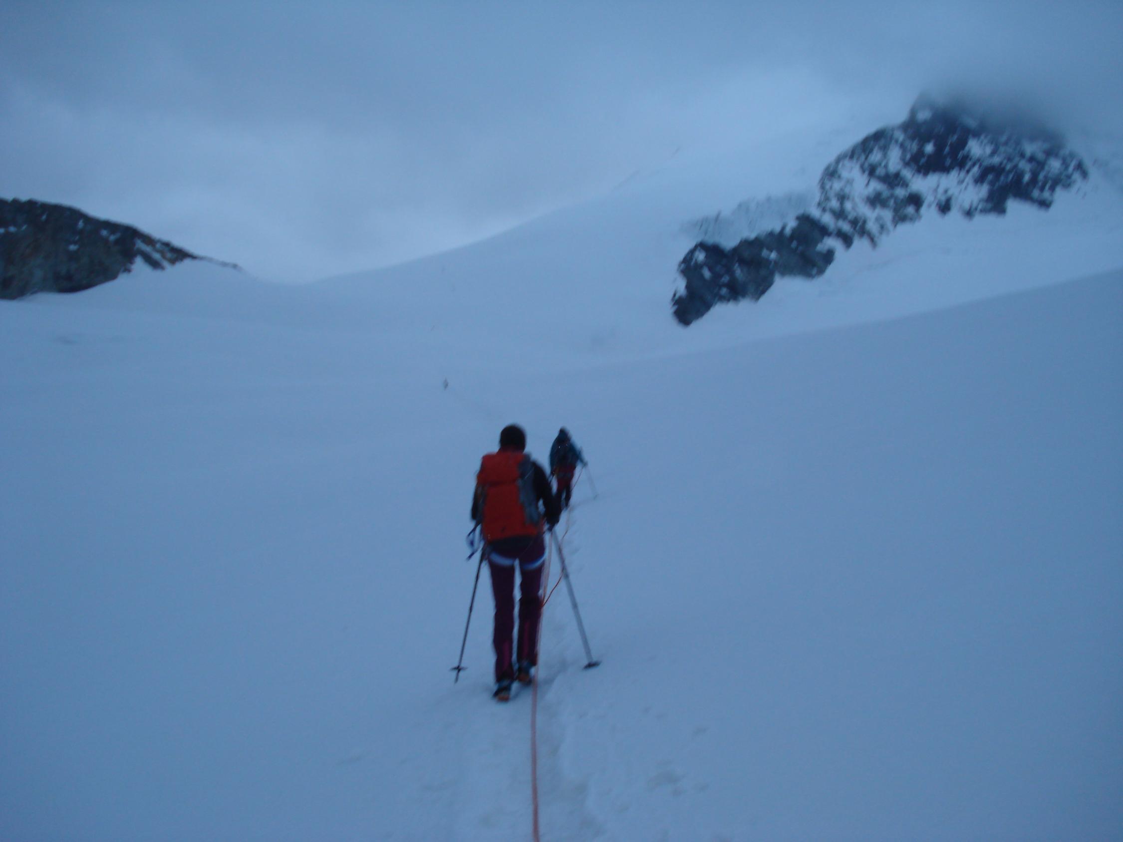 Aufstieg zum Bishorn ist gespurt. Allerdings dürfte der Wind die Spuren wieder mit Schnee zugedeckt haben. Mangels klarer Nacht war der Schnee bis zuoberst weich. Ab rund 3800 hat es Neuschnee, rund 10 bis 15 cm.. Gipfel über über Aufstiegskuppe gleich unterhalb des Gipfels problemlos machbar. Es hat schöne Tritte.