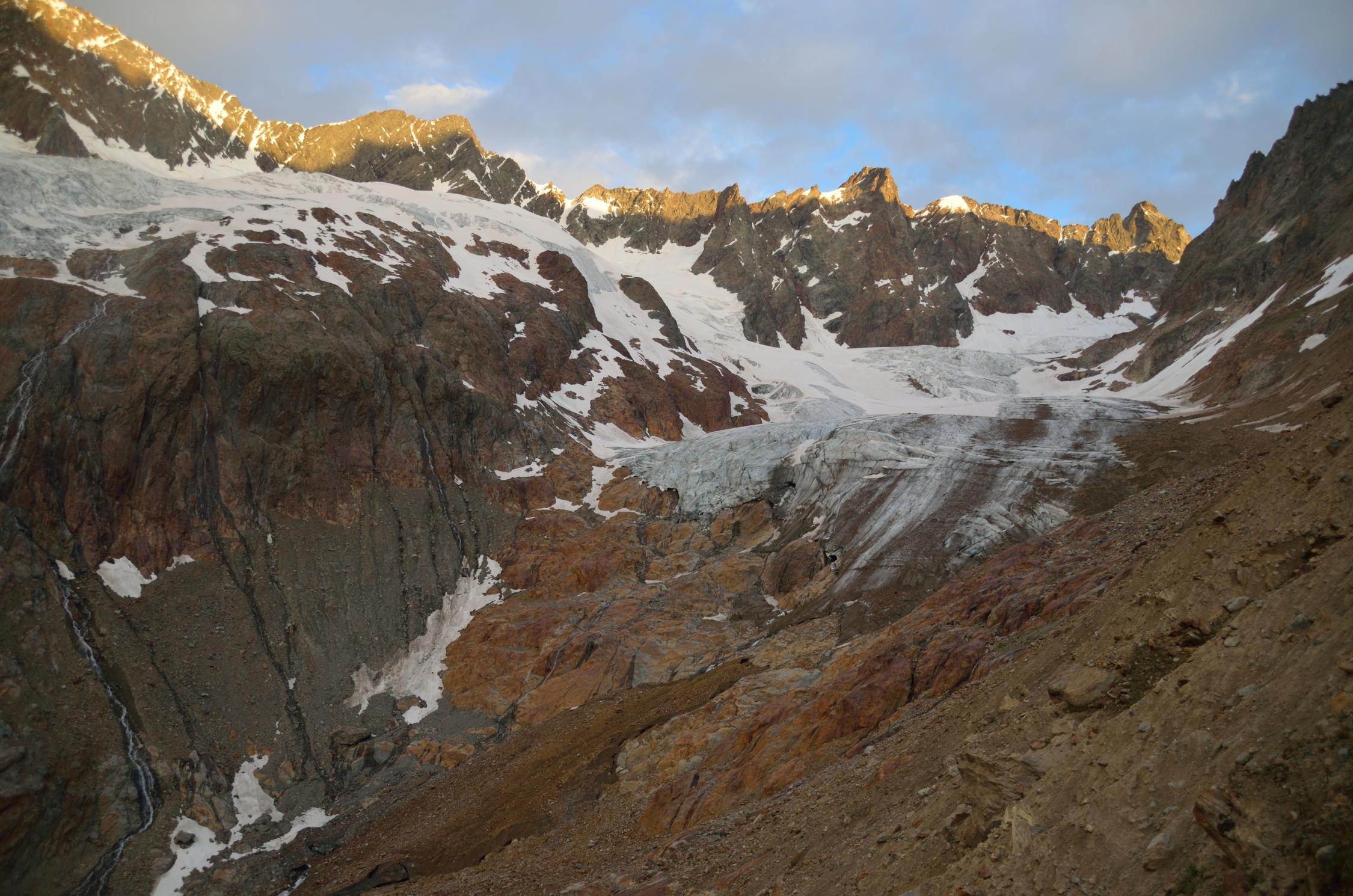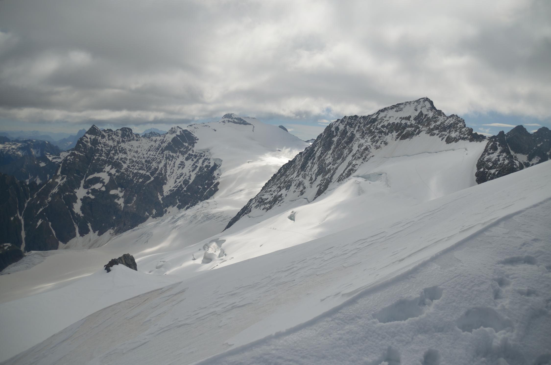 Der Abstieg zum Gletscher ist rutschig, lässt sich aber gut bewältigen. Auf dem Gletscher lag am frühen Morgen (6.00) noch gut tragender Schnee, so dass Spuren nur in den Steilhängen notwendig war.