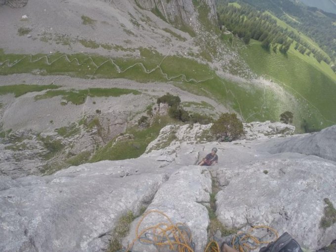 Schöne Route, tolle, abwechslungsreiche Seillängen. Einzelne Schlingen und Friends von Vorteil.