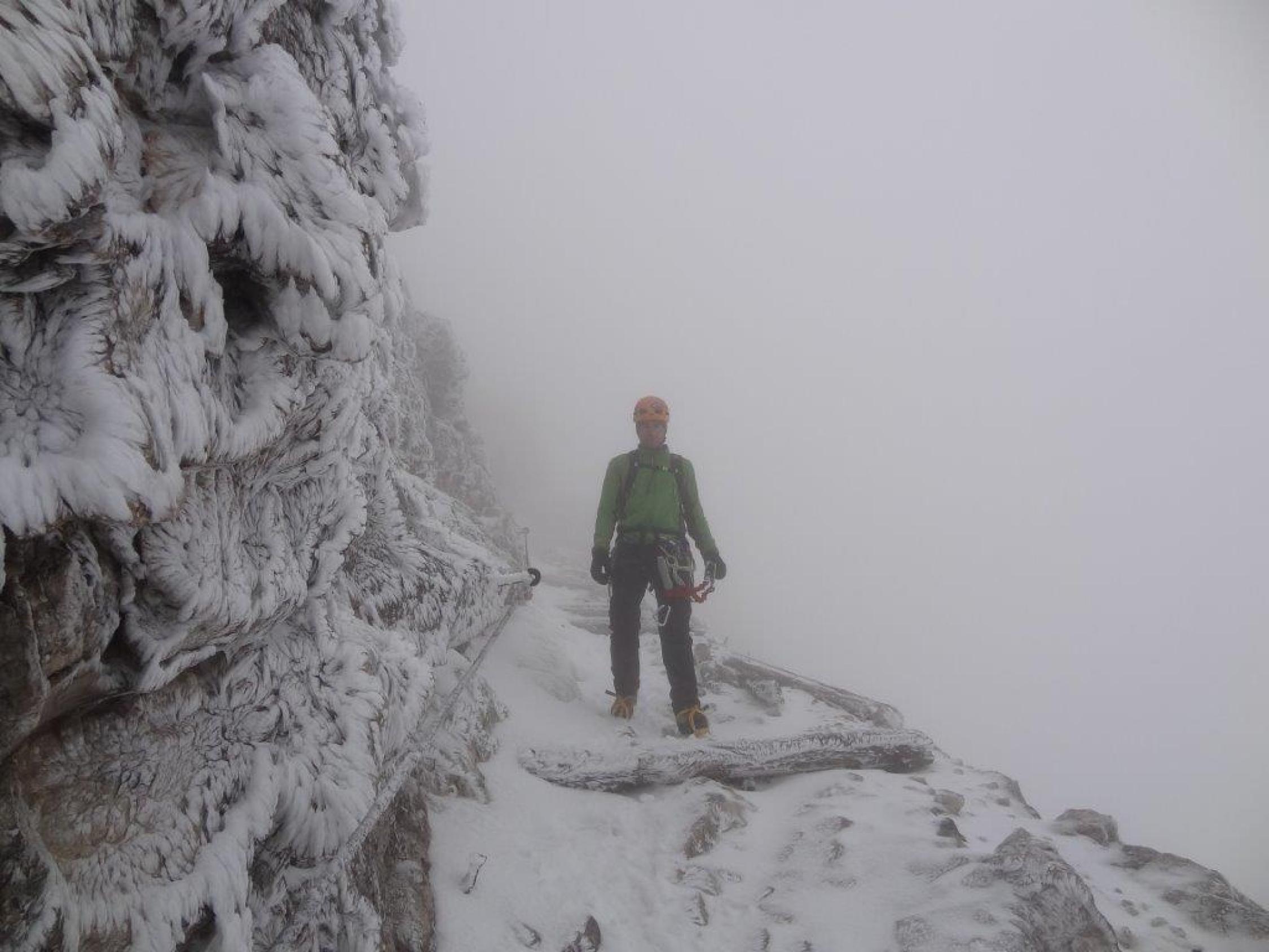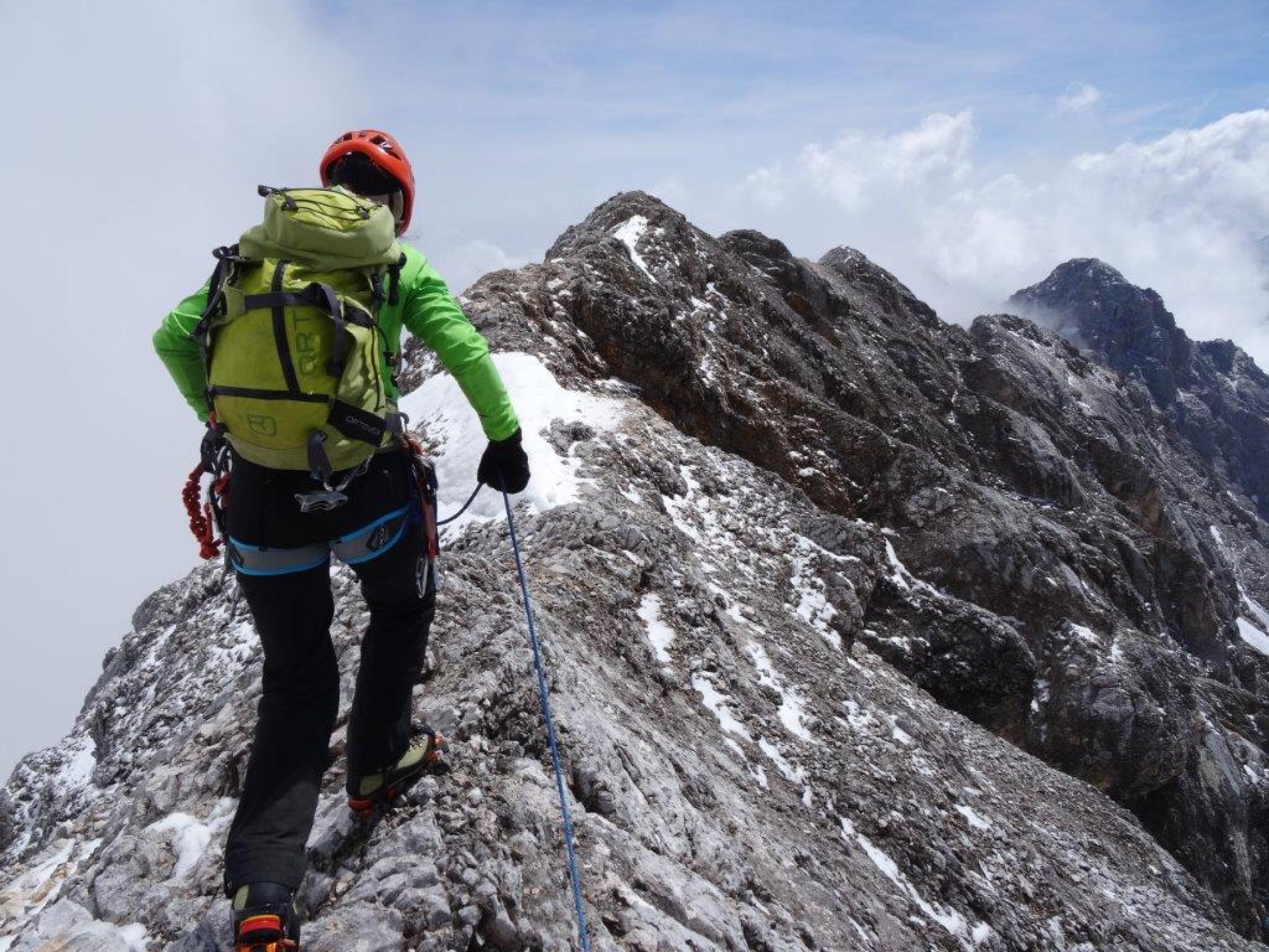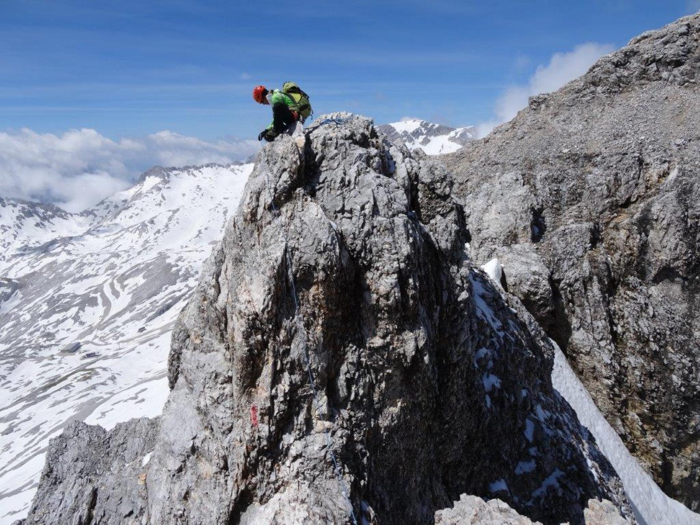 Noch hat es Schnee- und Wassereispassagen auf dem Grat, was Steigeisen fast unverzichtbar machen.