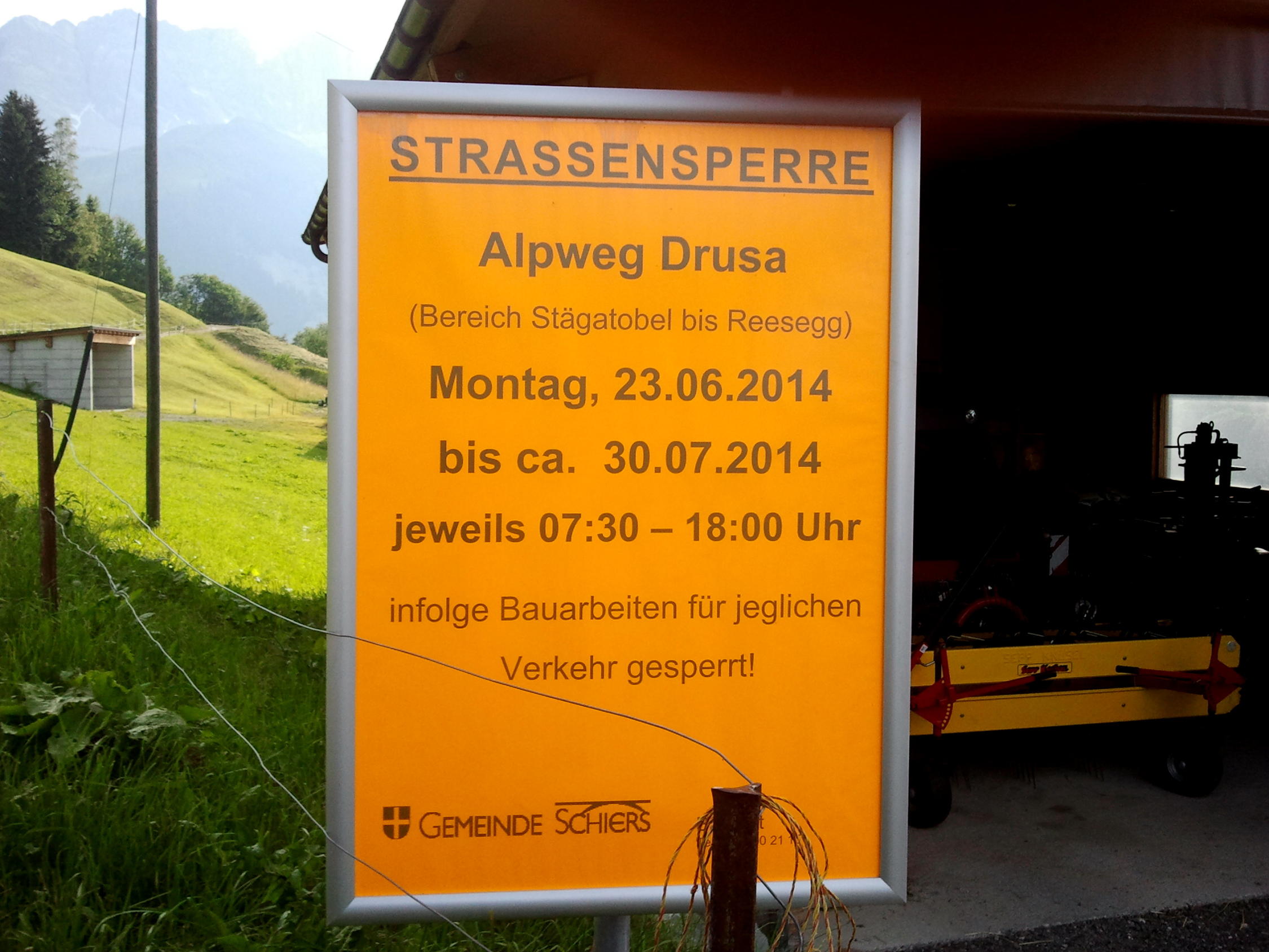 Bleibt gut, aber Achtung: die Strasse zum Grüscher Älpli ist ab sofort bis ca. Ende Juli jeweils werktags von 7.30-18.00 Uhr gesperrt!