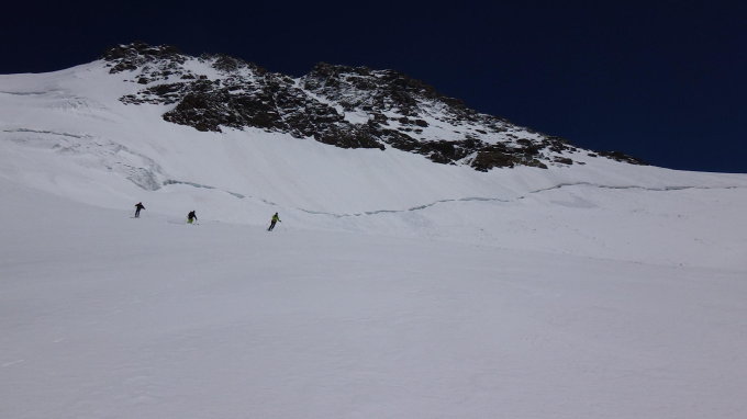Abstieg pulvrig von gipfel bis etwa 3500m dann sulz aber gut ski, keine spalten