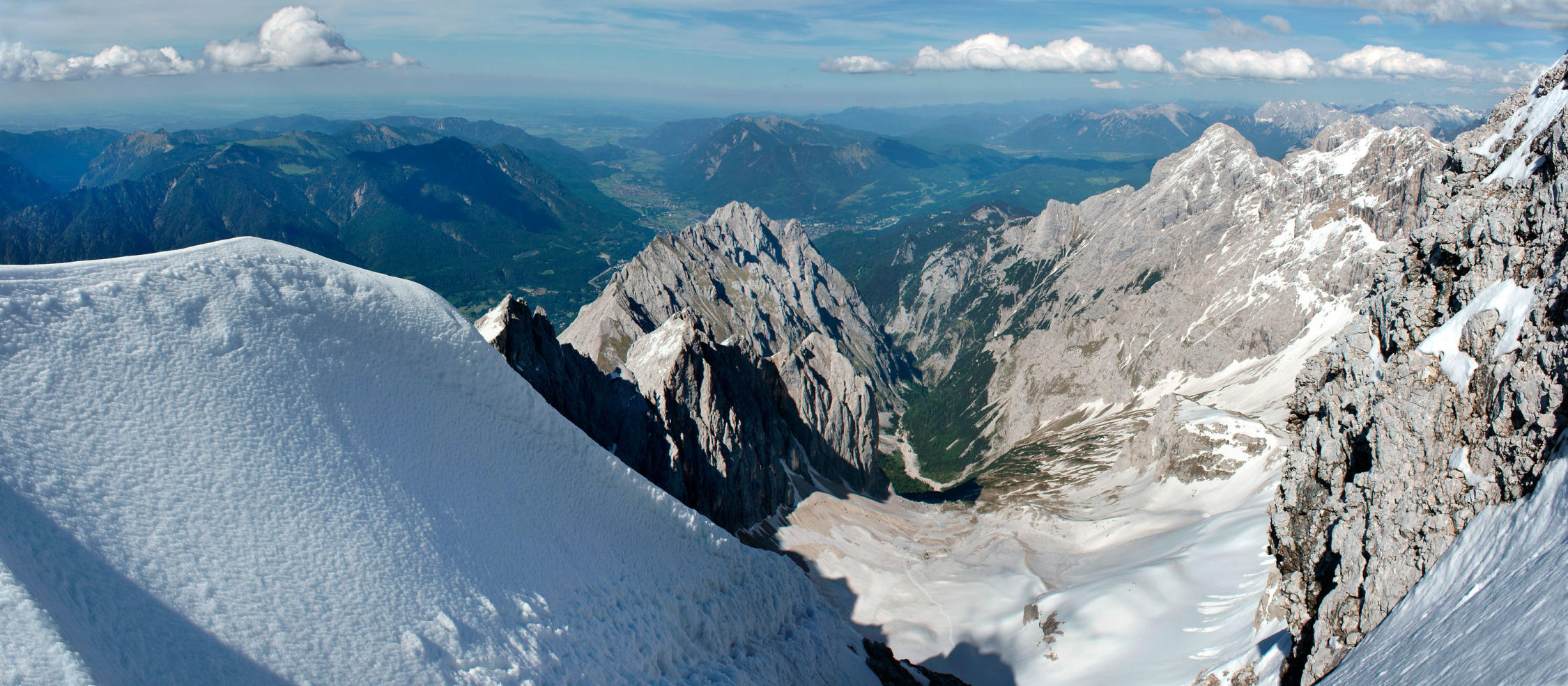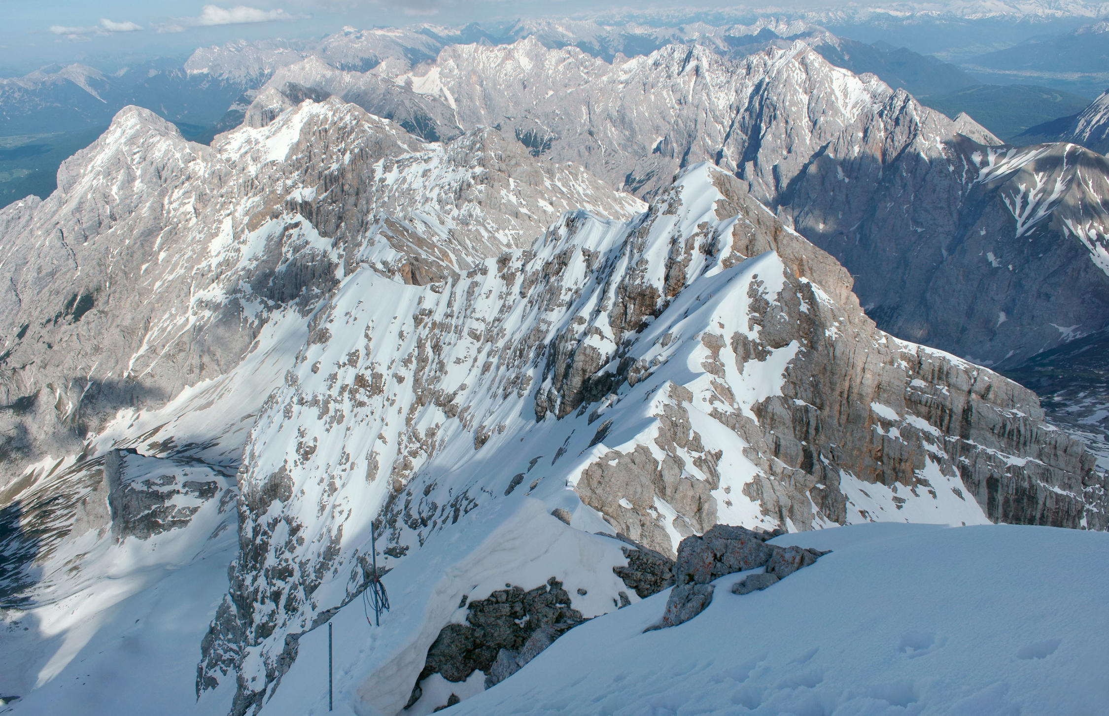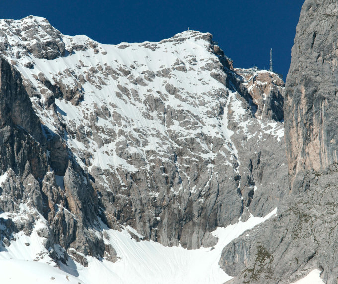 Im unteren Teil ab Start bei 750m sommerliche Verhältnisse. Die Höllentalangerhütte ist im Sommer 2014 durch Neubau nicht vorhanden! Die Sicherungsanlage bei 1600-1800m i.O. Ab 2100m durchgängige Schneedecke. Auf dem Gletscher tiefer Sulzschnee.