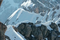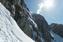Randkluft-Übergang zum Fels durch noch winterliche Schneeverhältnisse ohne Problem. Oberer Klettersteig ab 2700m mit Altschnee bedeckt. Größtenteils Sicherungsanlage unsichtbar. Steigeisen, Pickel zwingend notwendig. Die obersten 200hm freier Aufstieg über Schnee mit teilweise vereister Unterlage in der N-O-Flanke.