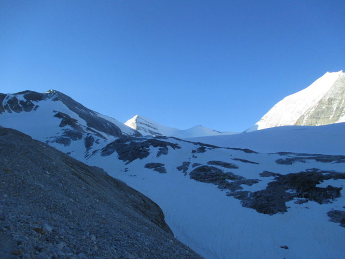 Ab ca. 3070m betritt man den Brunegggletscher, wo man momentan bei guter nächtlicher Abstrahlung beste Tourenverhältnisse antrift, (Mit oder ohne Ski)