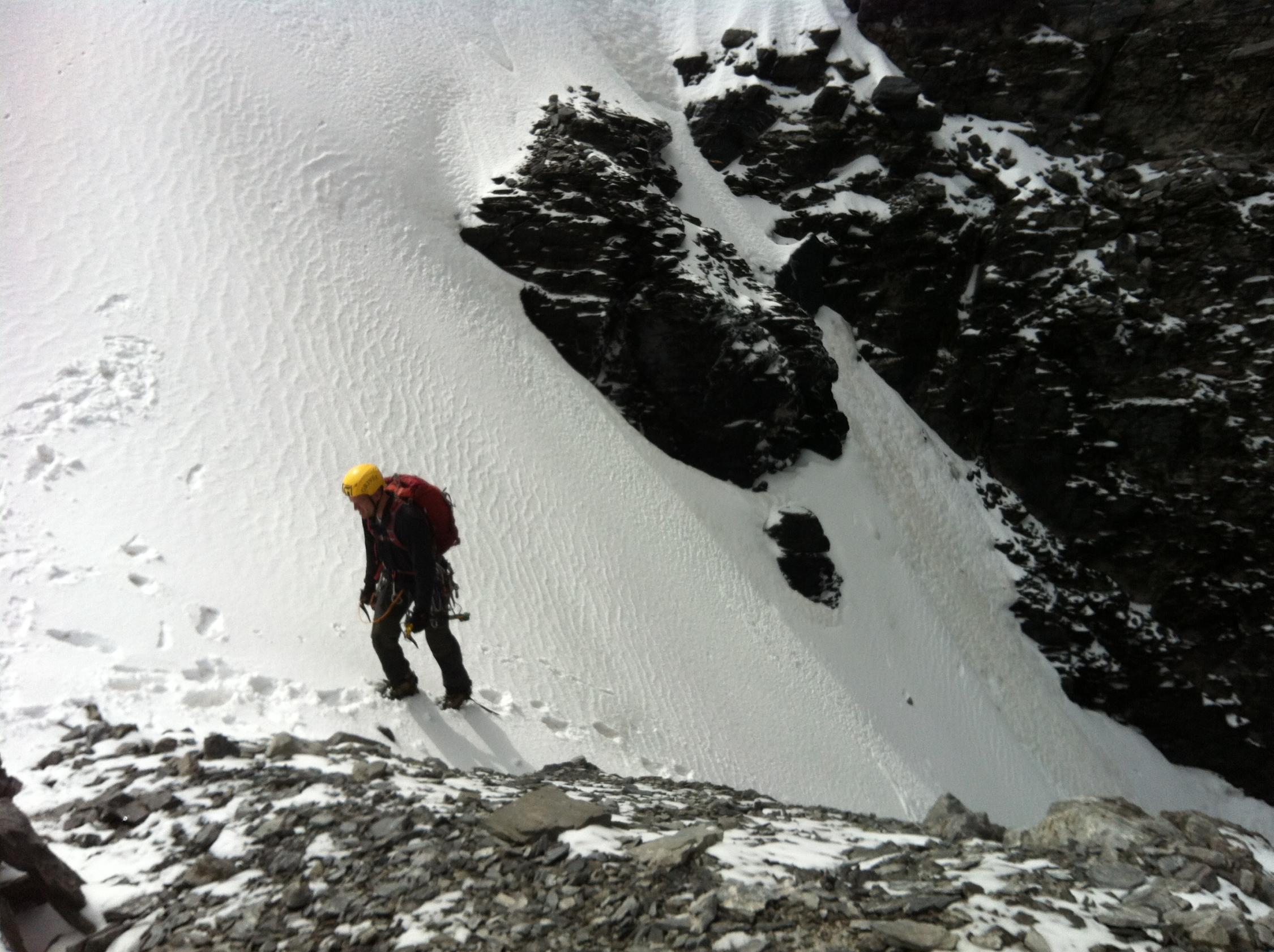 Alles seilfrei gegangen, nur 30m kurz vor dem Gipfelfirnfeld gesichert, da vereister Fels und ziemlich expo.