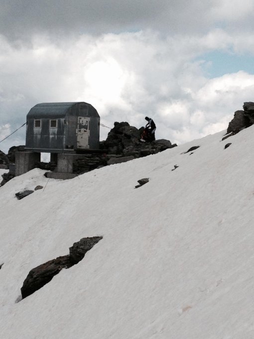50 Meter bis Ausstieg dünne Schneeauflage,am Ausstieg selber blank,haben daher von der Abfahrt durch die Nordwand abgesehen. Abfahrt über Gletscher zum See auf Pt. 2768. Danach zu Fuss nach Saas Balen.