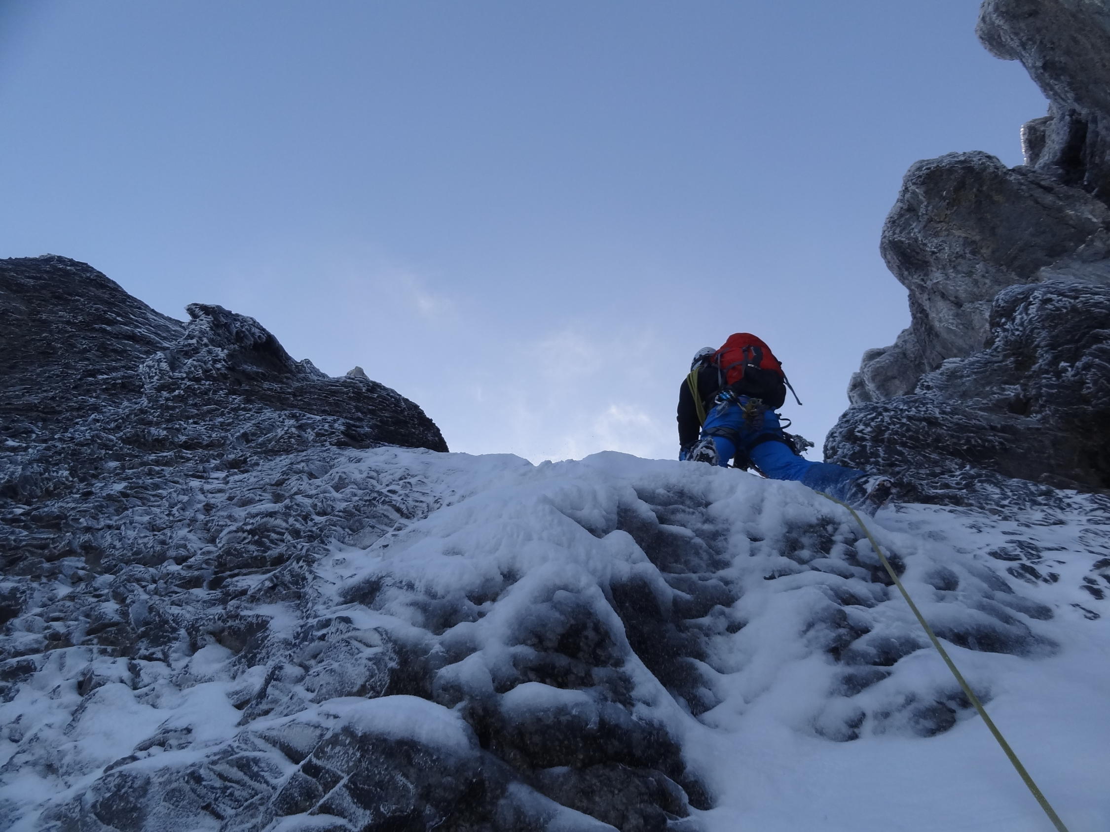 Zur Zeit ideale Verhältnisse in der ganzen Wand. Guter Trittschnee, kaum vereister Fels (aber öfters nass).