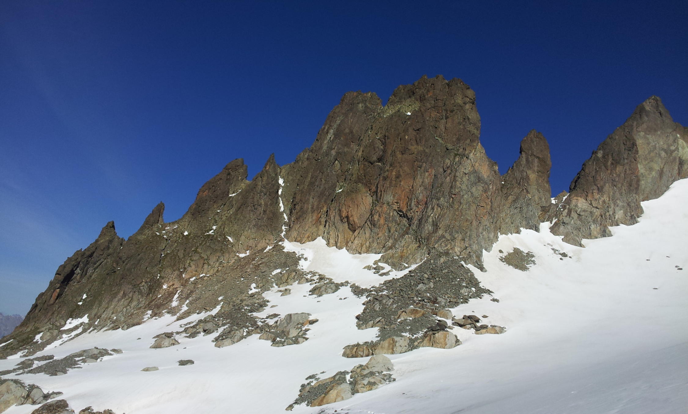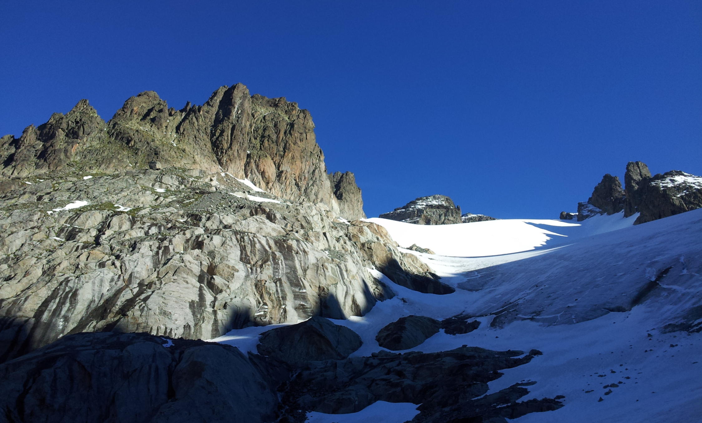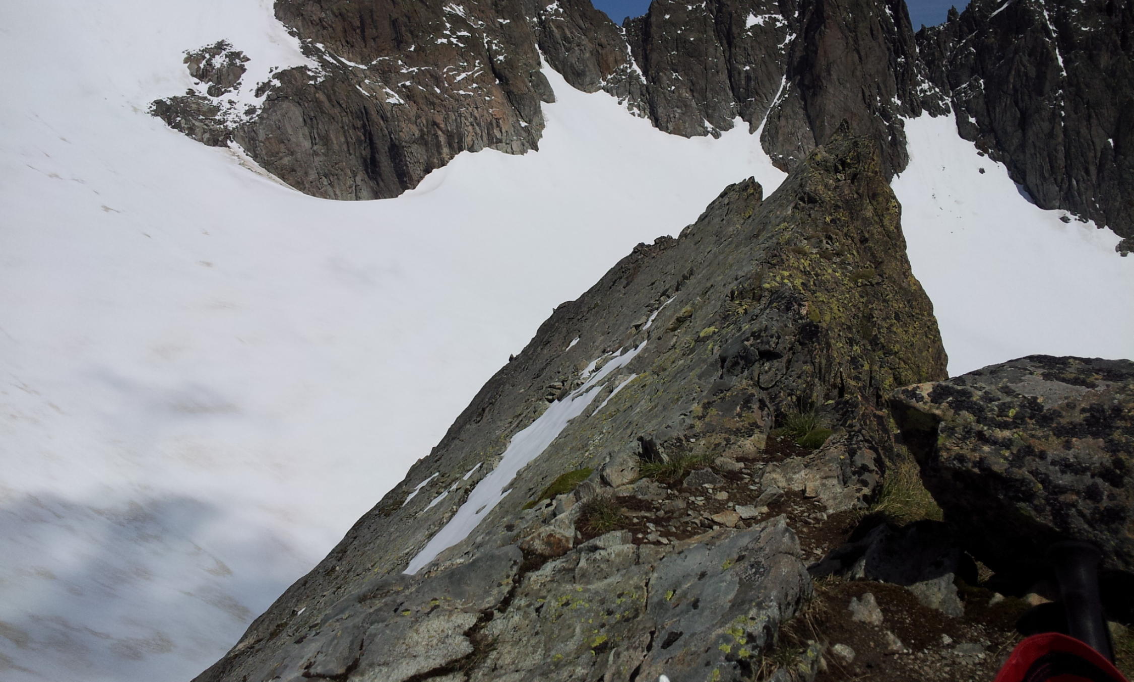 Flanke zum Einstieg sowie ganzer Grat schneefrei.