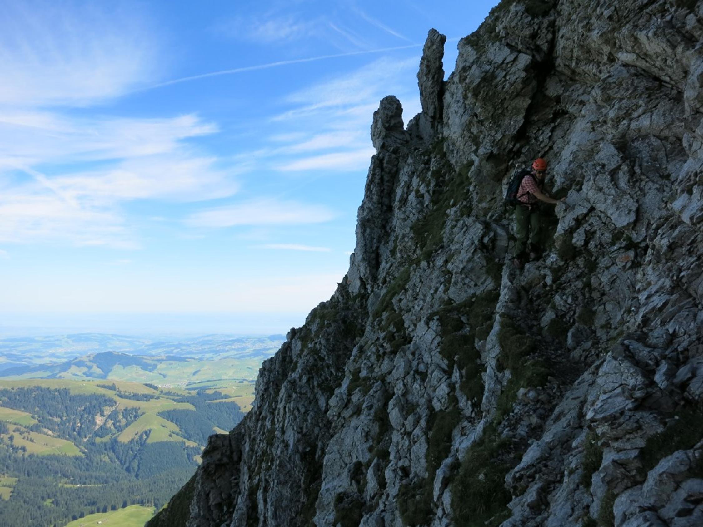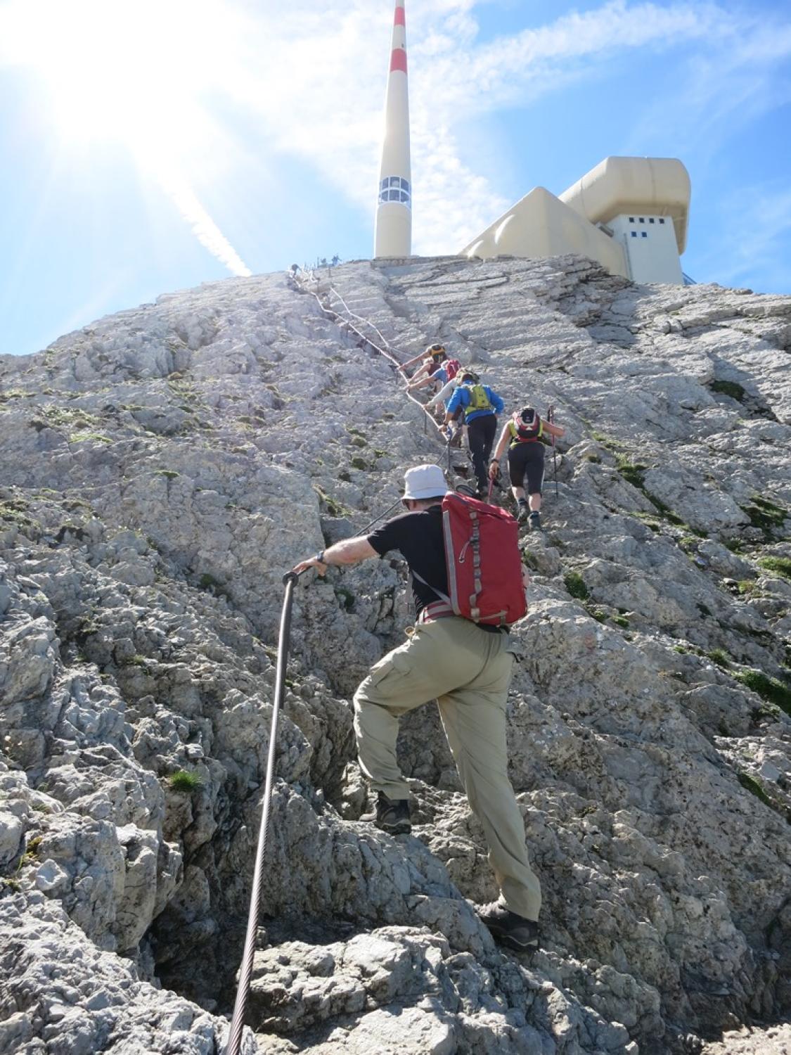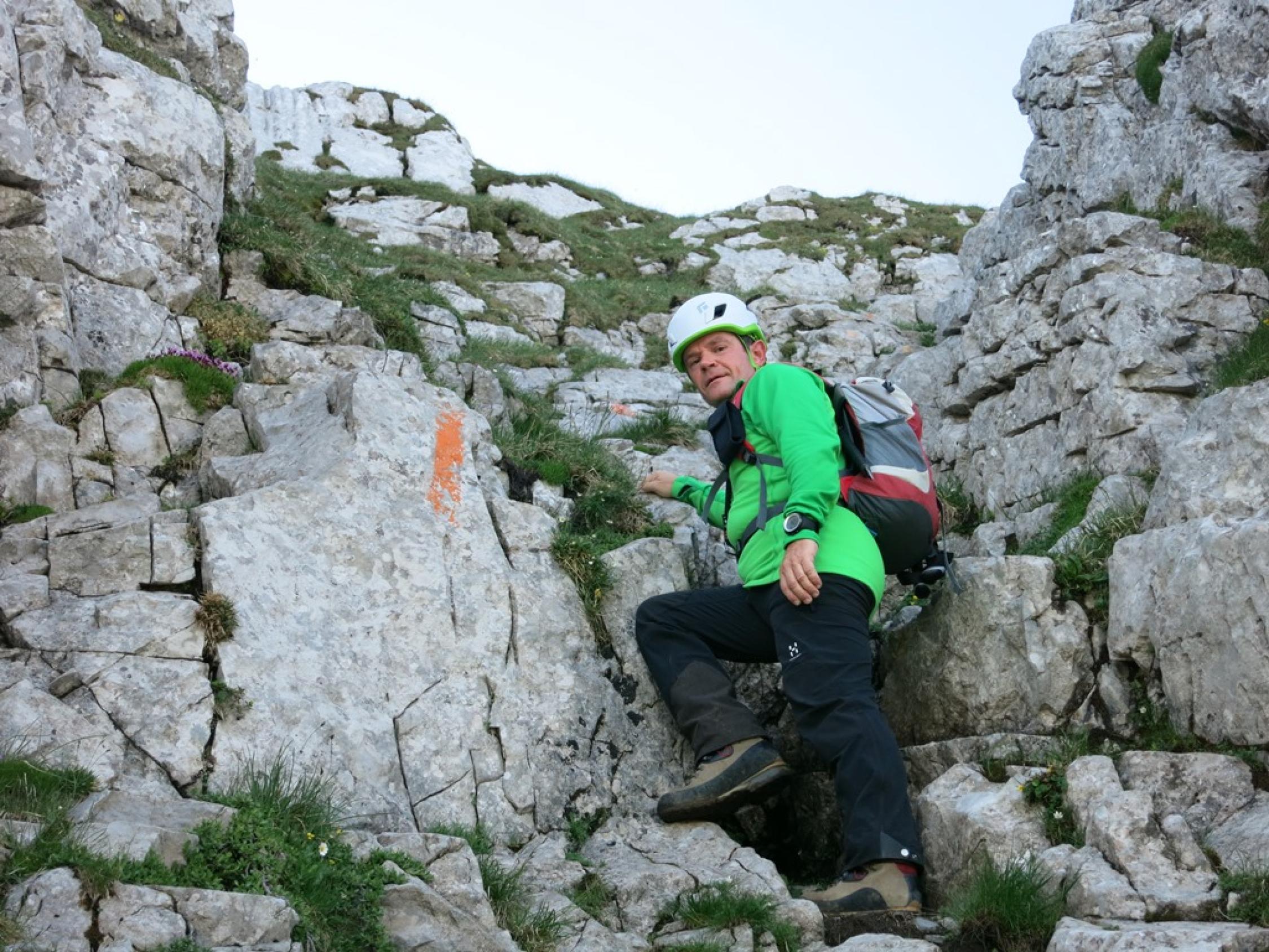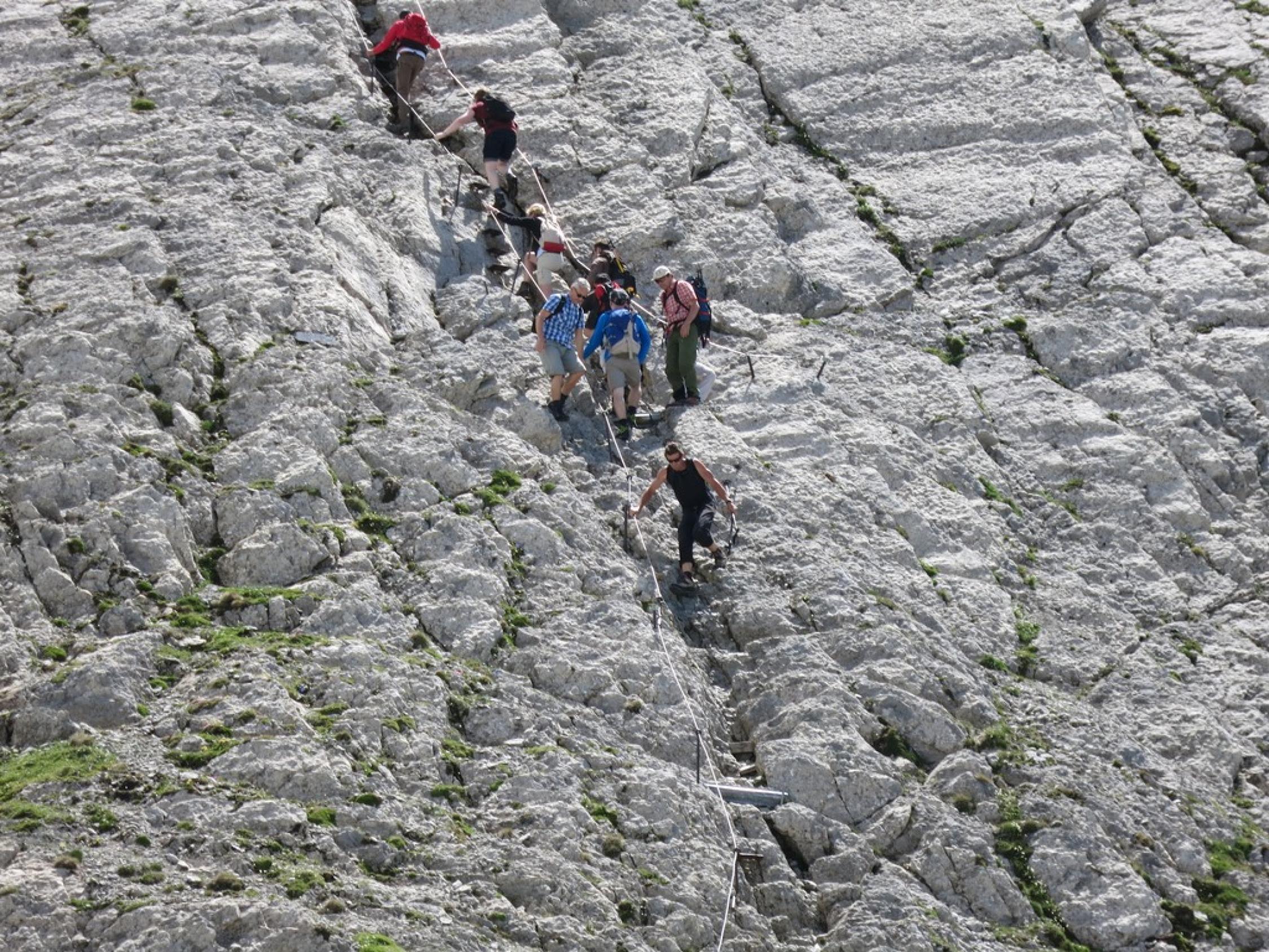 Für die Begehung der Chammhaldenroute empfehle ich einen Steinschlaghelm, da weiter oben viel loses Geröll liegt, und andere Berggänger in der Route sein könnten; wie heute z.B. da waren wir nicht alleine…