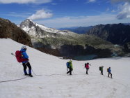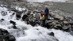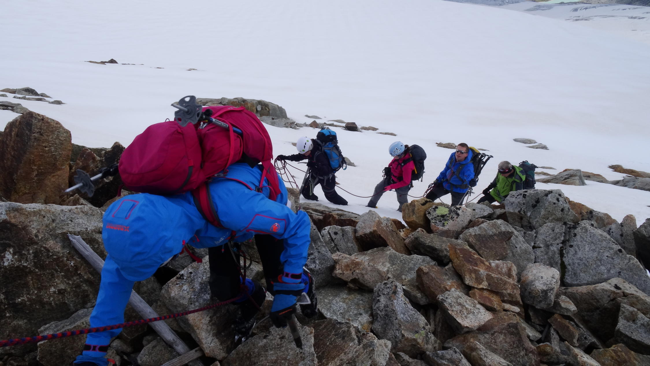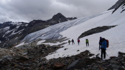 Markierter Weg von der Hütte in gutem Zustand. Querung zum Gletscher hat noch einige Schneefelder