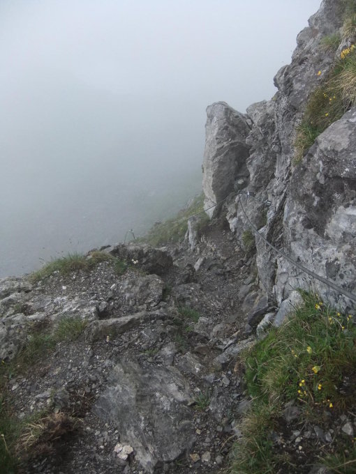 Nach erfolglosem Versuch am 17.11.2012 nun mit vorhandener Seilsicherung hinauf. Leider im Nebel und zweitweise Nieselregen anfangs unterwegs. Beim Abstieg mittags riß es dann auf und der Berg präsentierte sich hinter mir in voller Ansicht. Im Abstieg kam mir ein KS-Pärchen entgegen, die angeblichen (wo ?), neuen KS durch die Westflanke suchten. Ich hatte allerdings im Nebel keinen Abzweig oder Hinweis bis zum Einstieg gefunden, als daß dieser schon eingerichtet wäre. Unterhalb des Gipfels fand ich jedoch auf dem Südgrat noch eine Kabeltrommel und Sicherungsseilrollen. Am Ende des Geröllplateaus war die Sicherungsstange und gespanntes Seilende zu sehen. Und das Hinweisschild am KS Südgrat, diesen KS im Abstieg zu benutzen. Offensichtlich steht ein KS durch die Westseite vor Fertigstellung (oder ist sogar schon eingerichtet ?), so daß eine KS-Rundtour möglich würde (Gute Idee zur "Stau"-Entlastung zwischen Auf- u. Absteigenden, bei Wetterlagen wie nicht heute) . Wer weiß mehr oder genaueres ? Ich wäre über mehr Info dankbar !