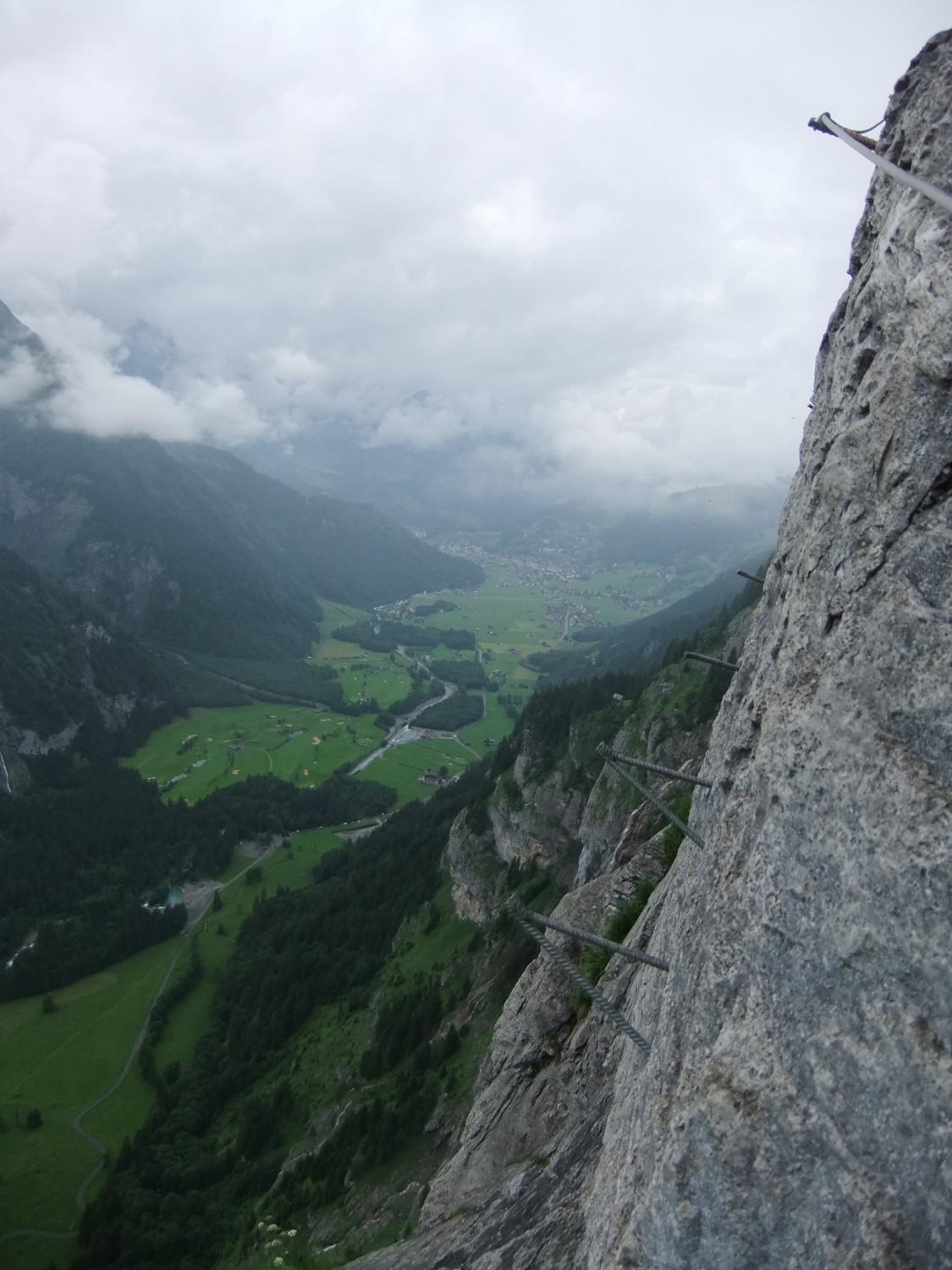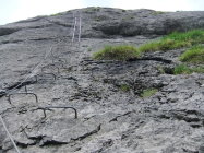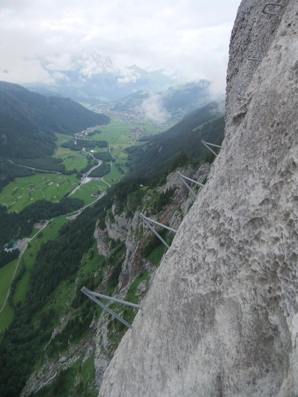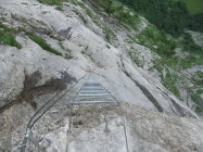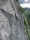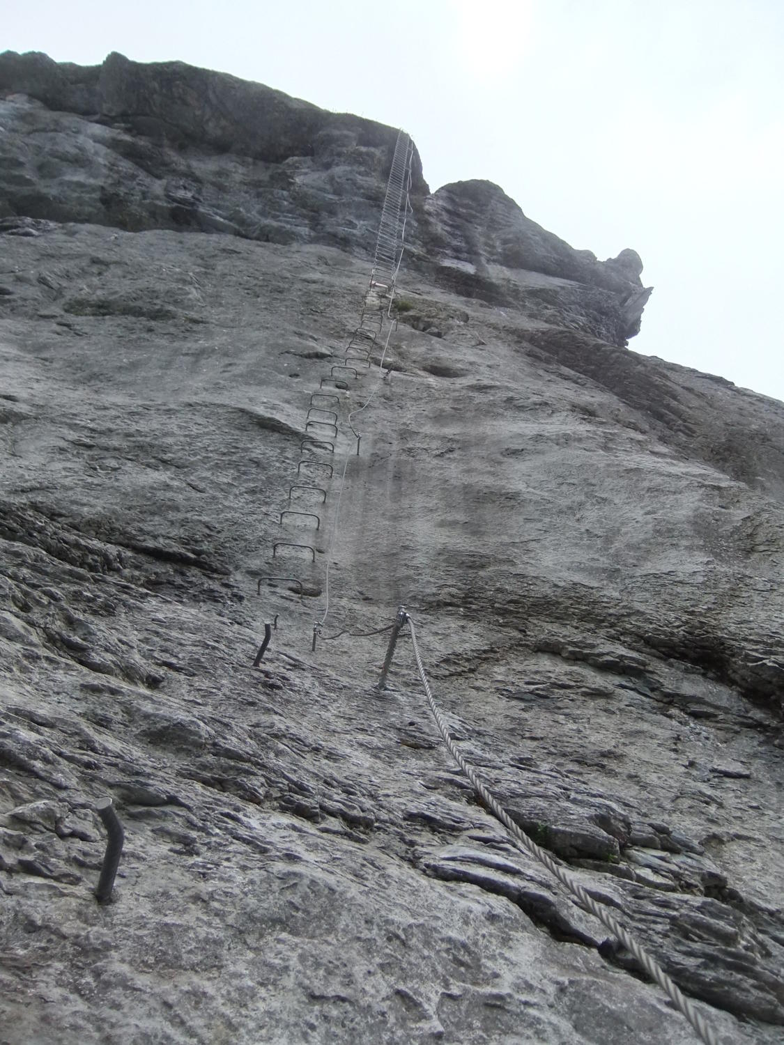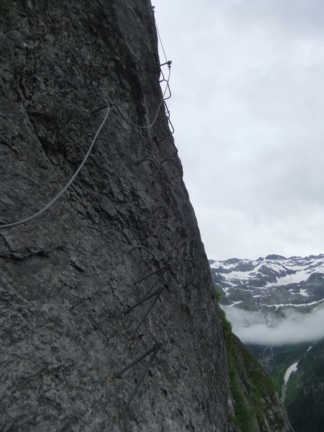 Einstieg um 14:30 Uhr nach morgendlicher Tour zum Rigidalstock. Die Route hat's durchaus in sich. Am Ende hat man fast 500 m Luft unter den Sohlen. Nicht nur Psyche, sondern auch Ausdauer ist dann abschließend noch gefragt auf der frei vor konkavem Fels aufgehängten Strickleiter unterhalb des Ausstiegs. Ankunft Bergstation: 16:50 Uhr. Abfahrt mit der kleinen Gondel, die nach Telefonbetrieb funktioniert (Einsteigen, Taste drücken), um 17:20 Uhr in 10 min. hinab.