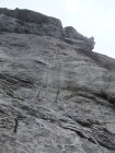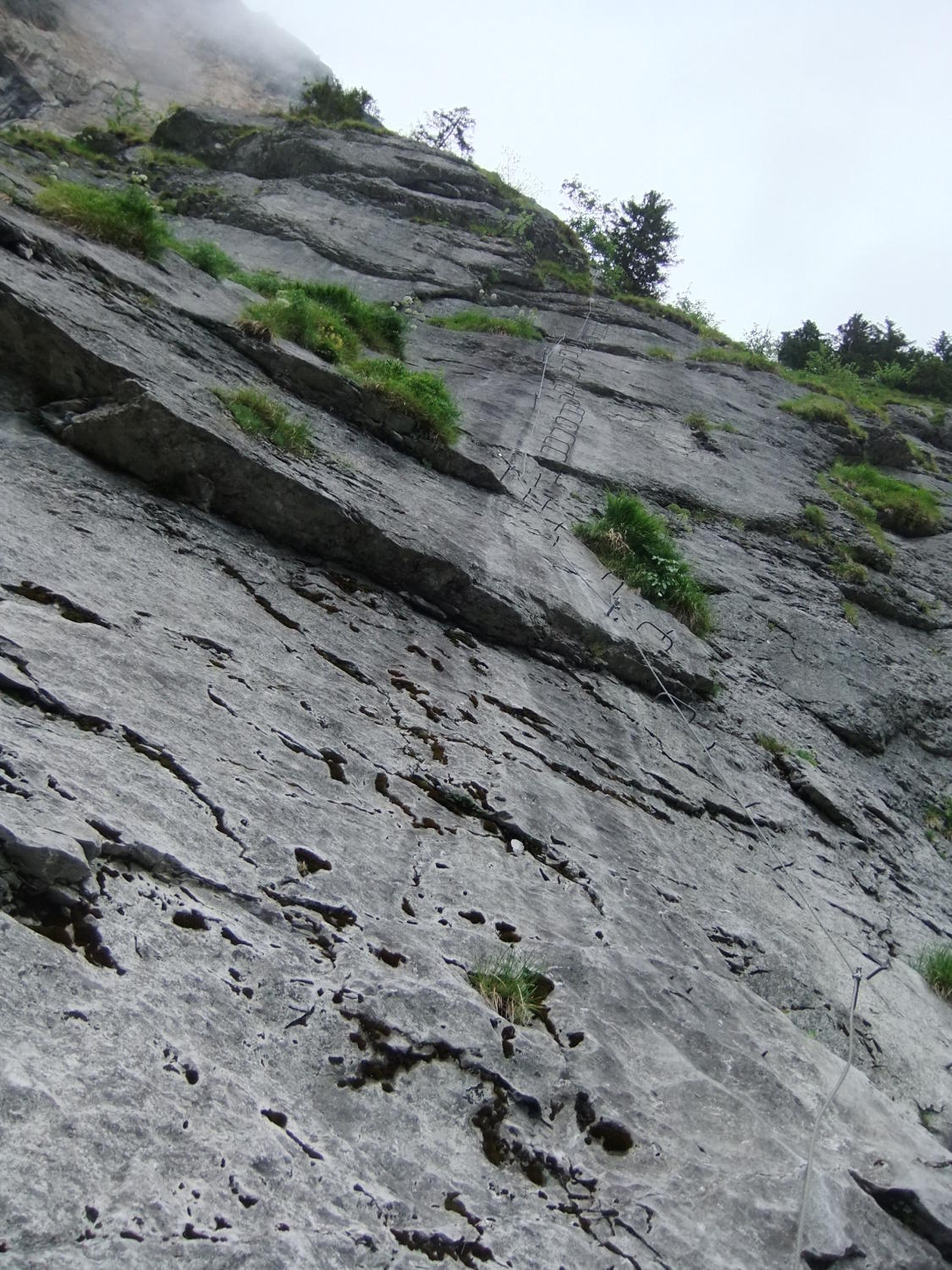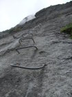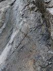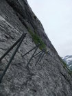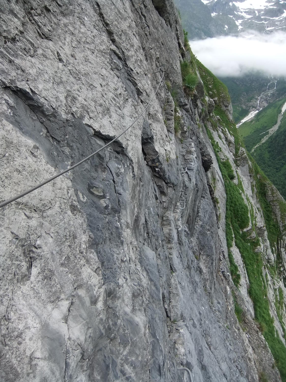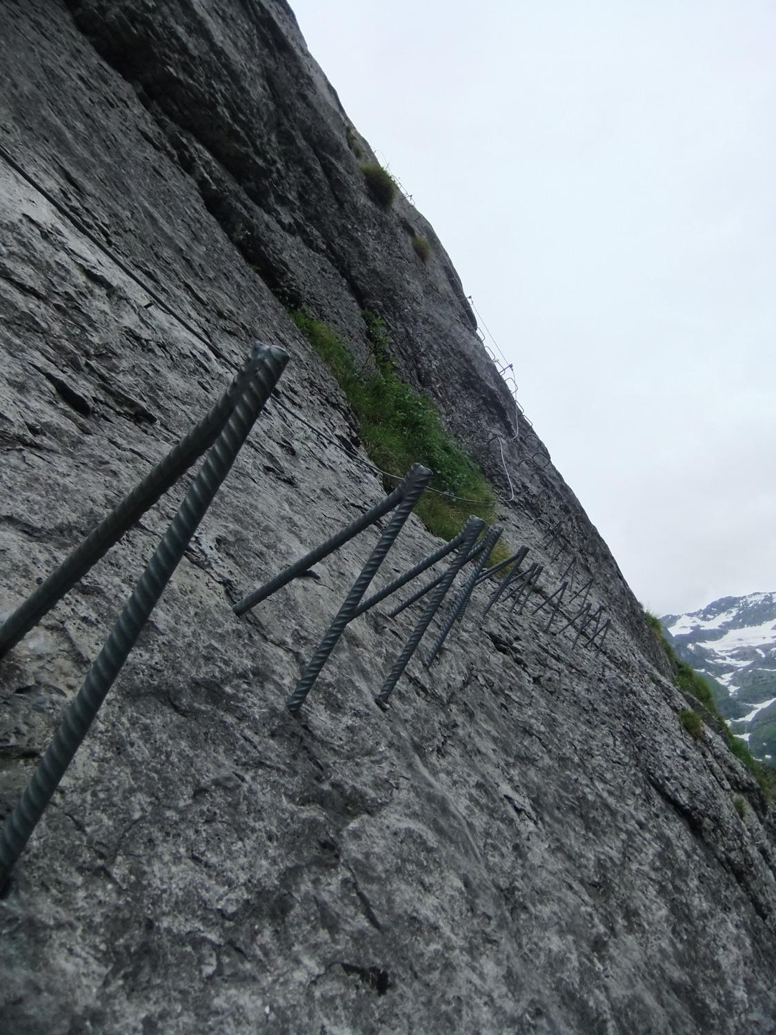 Einstieg um 14:30 Uhr nach morgendlicher Tour zum Rigidalstock. Die Route hat's durchaus in sich. Am Ende hat man fast 500 m Luft unter den Sohlen. Nicht nur Psyche, sondern auch Ausdauer ist dann abschließend noch gefragt auf der frei vor konkavem Fels aufgehängten Strickleiter unterhalb des Ausstiegs. Ankunft Bergstation: 16:50 Uhr. Abfahrt mit der kleinen Gondel, die nach Telefonbetrieb funktioniert (Einsteigen, Taste drücken), um 17:20 Uhr in 10 min. hinab.
