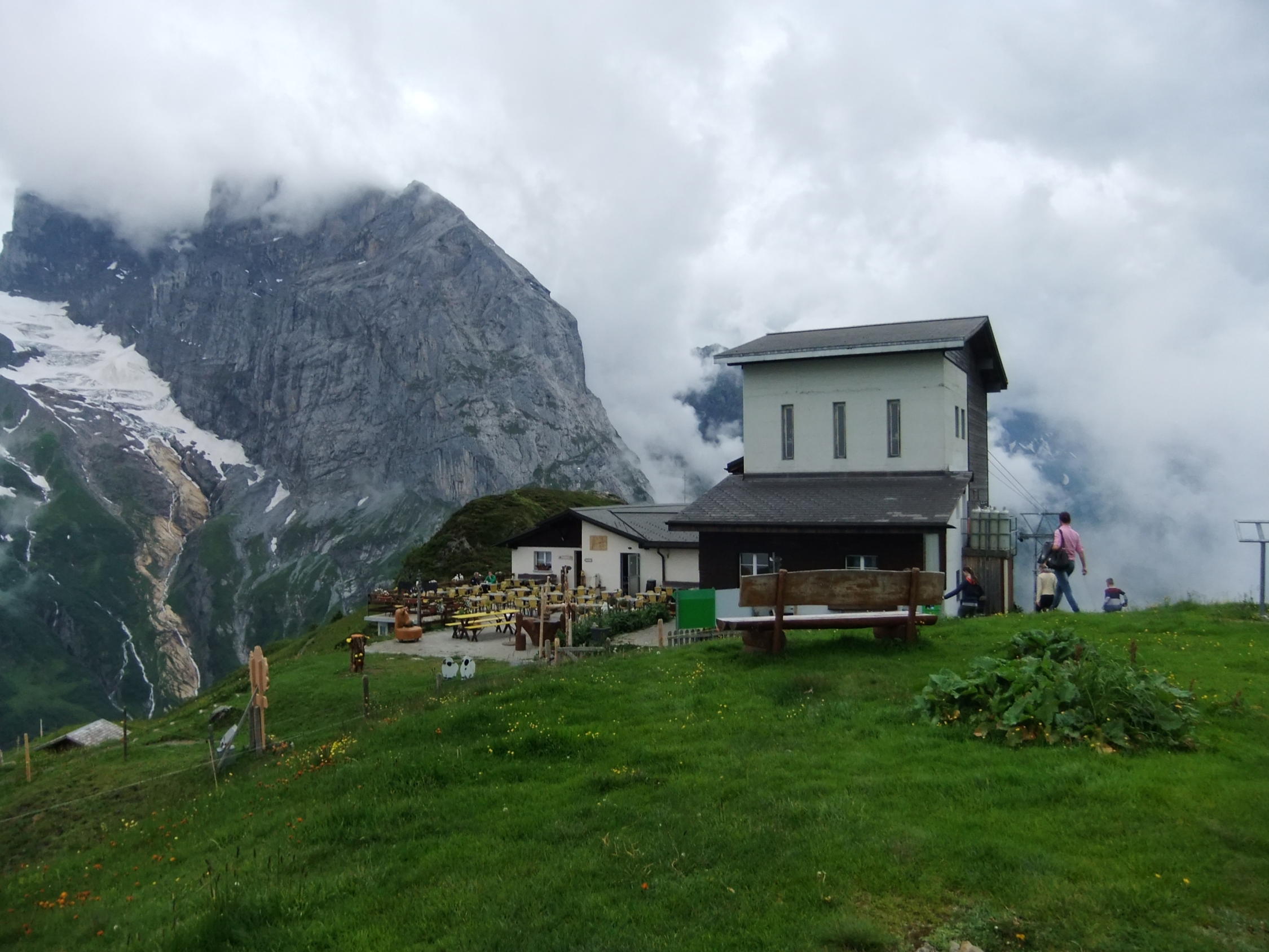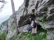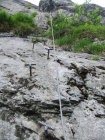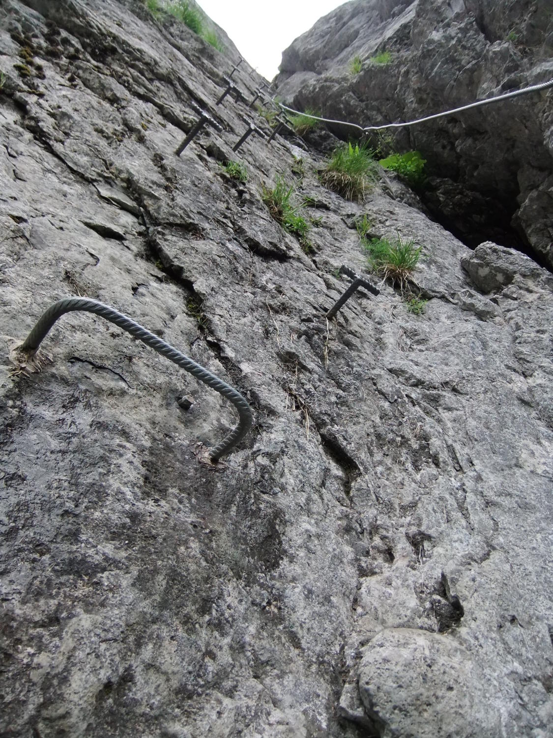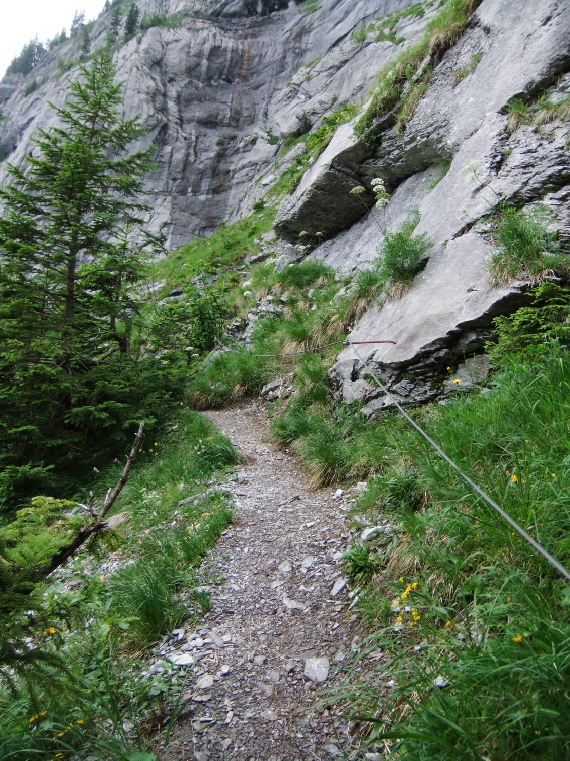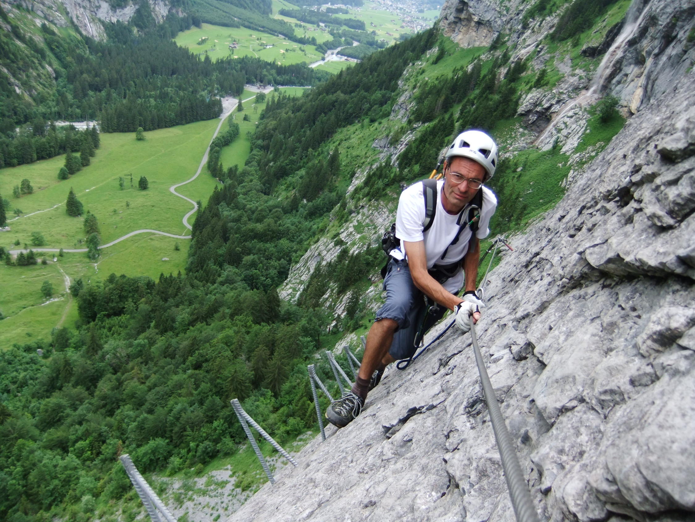 Einstieg um 14:30 Uhr nach morgendlicher Tour zum Rigidalstock. Die Route hat's durchaus in sich. Am Ende hat man fast 500 m Luft unter den Sohlen. Nicht nur Psyche, sondern auch Ausdauer ist dann abschließend noch gefragt auf der frei vor konkavem Fels aufgehängten Strickleiter unterhalb des Ausstiegs. Ankunft Bergstation: 16:50 Uhr. Abfahrt mit der kleinen Gondel, die nach Telefonbetrieb funktioniert (Einsteigen, Taste drücken), um 17:20 Uhr in 10 min. hinab.