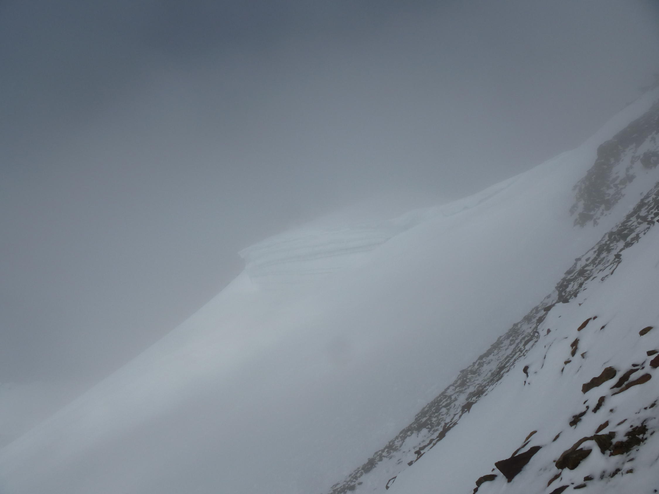 Übergang von Nordgipfel auf den Südgipfel sehr stark überwächtet. An mehreren Stellen des Grates ist die Wächte, trotz großen Abstandes zum Wächtenrand, abgebrochen. Einmal sogar bis fast zur alten Aufstiegsspur.
