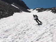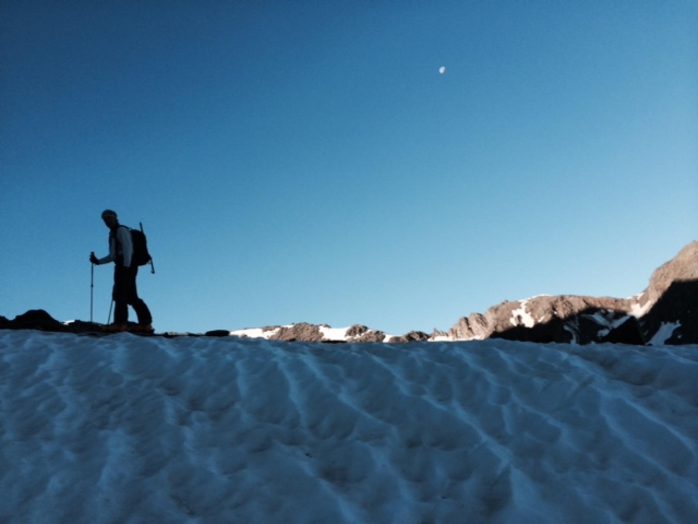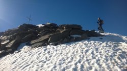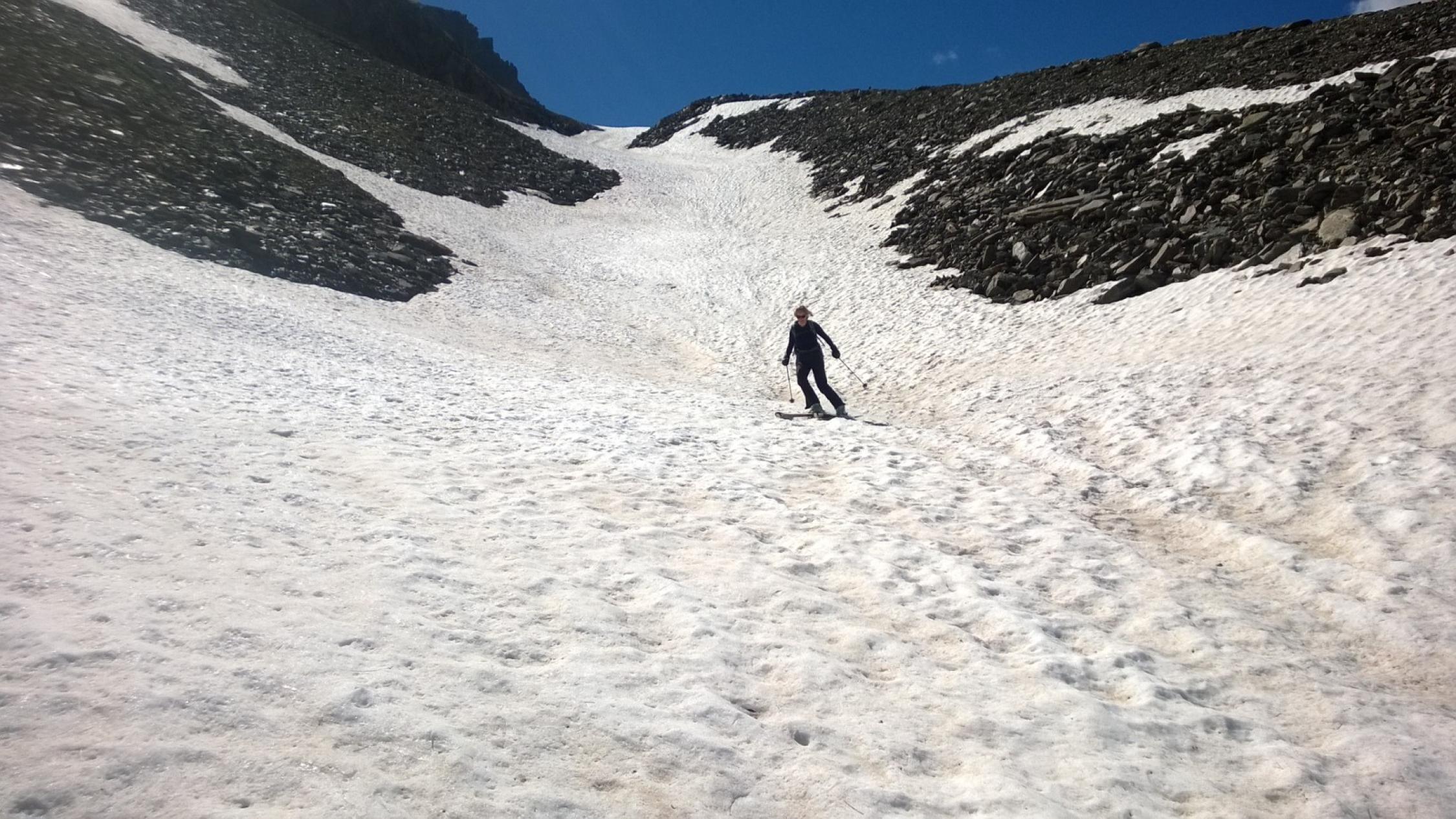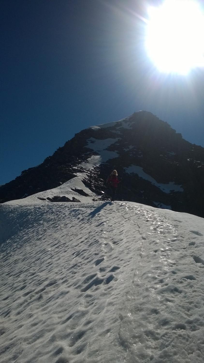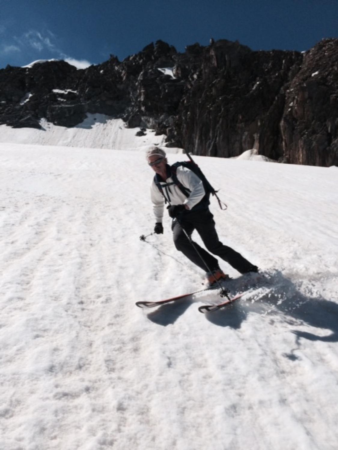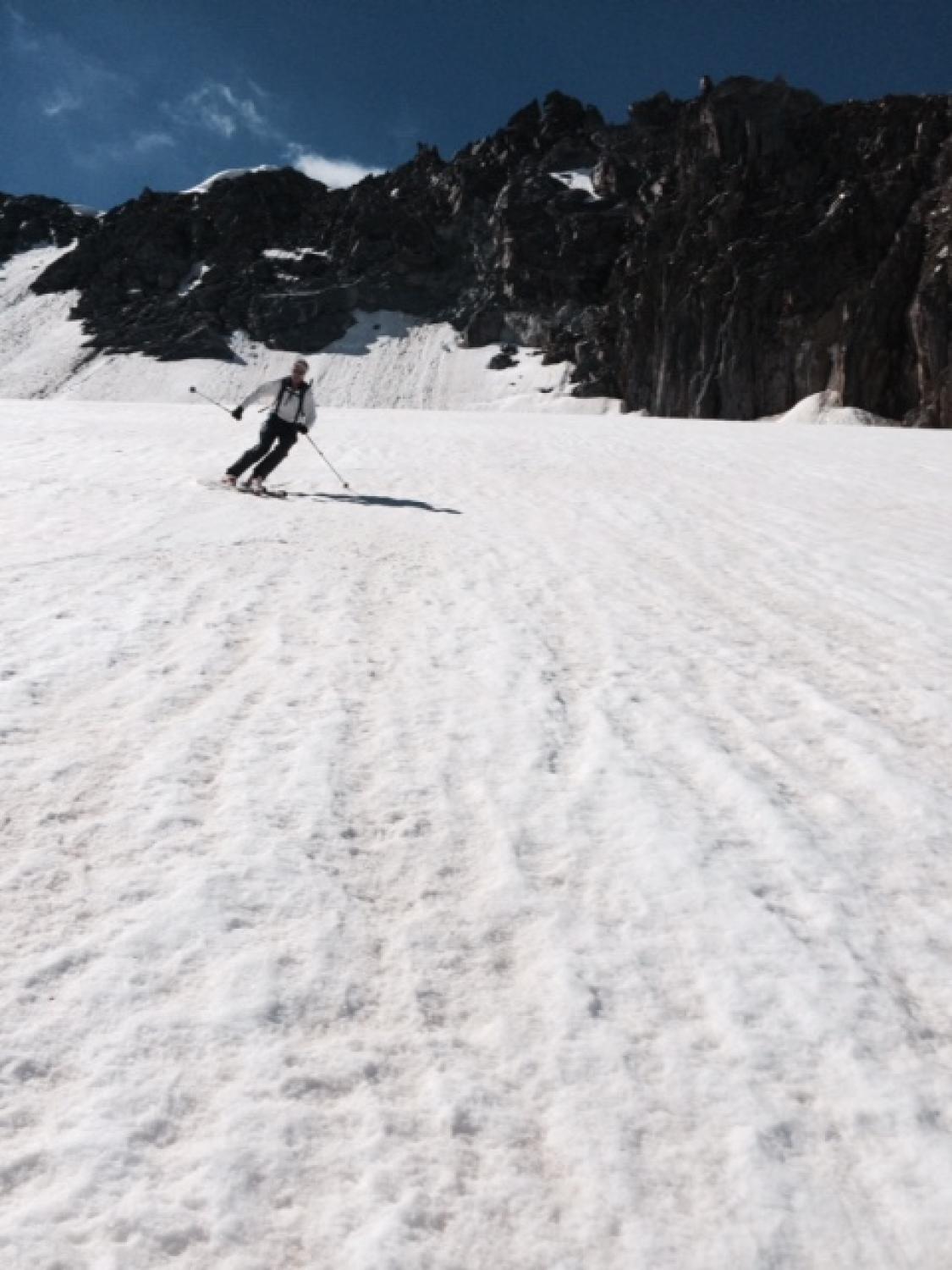 Ski bei der Militärstrasse an- und abgezogen. Schnee war am Morgen hart, gefroren und durchwegs tragend, teilweise Sommerhärte. Abfahrt um 10.00 war perfekt angetaut und sehr schön, früher wäre das ein beinahe unfahrbares Wellblech gewesen. Gletscher ist noch sehr gut eingeschneit, ausser zwei Sommertourengänger haben wir niemanden angetroffen. Ski nur bis zum Grat mitgenommen, oben waren zu viele apere Stellen