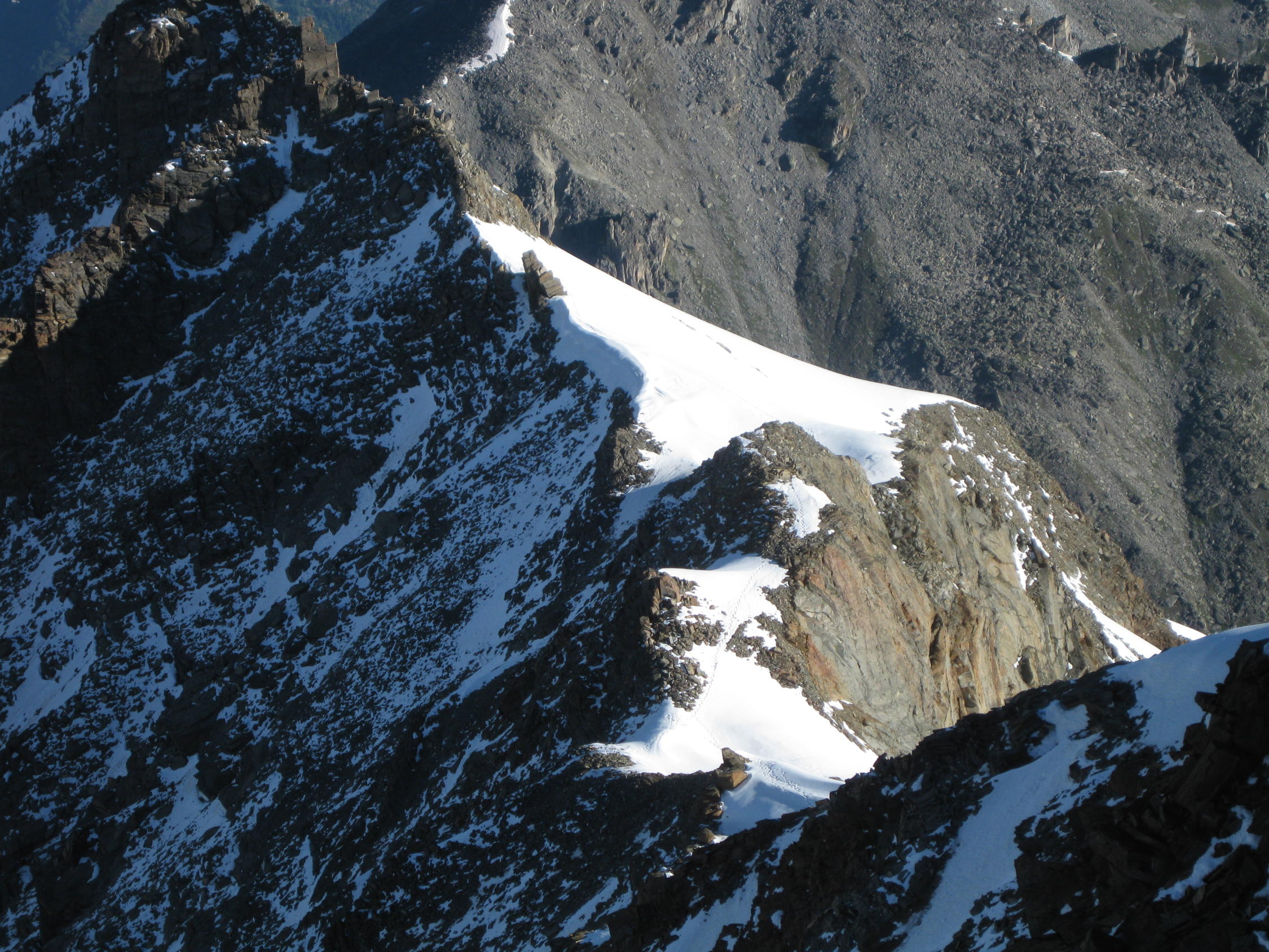 Spalten am Ried gut eingeschneit, Balfrin-Südgrat weitgehend aper, zwischen Gr.Bigerhorn und Balfrin vergleichsweise noch viel Schnee für diese Jahreszeit, jedoch gute Spuren.