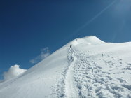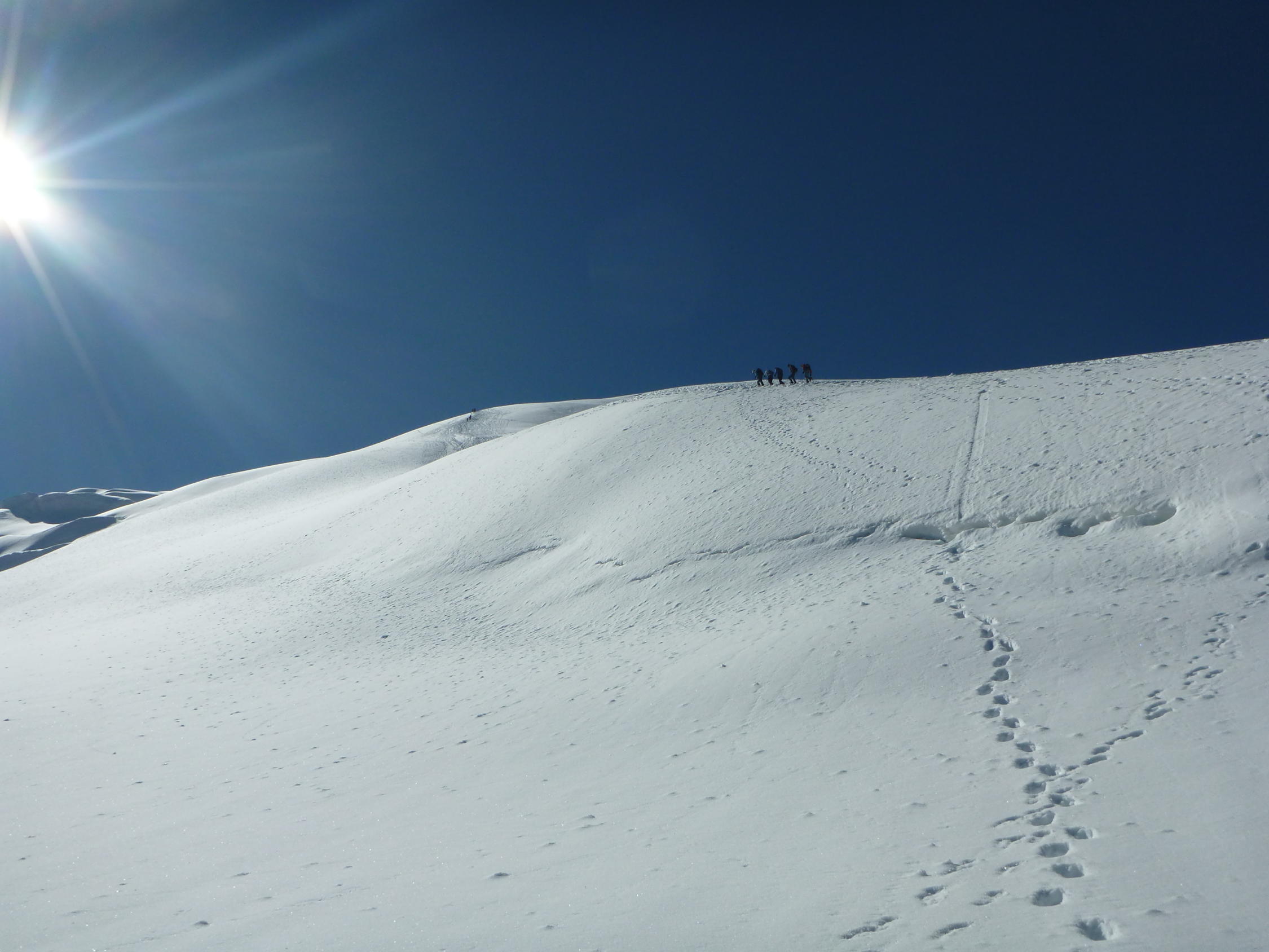 Eine gute griffige Spur führt vom Einstieg unterhalb der Bahn Hohsaas bis auf den Gipfel.