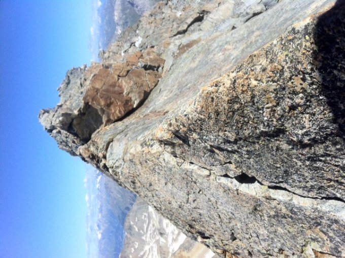 Der Ausstieg auf den Gletscher am besten ohne Abseilstelle einfach absteigen (wenig schwierig und sicherer). Der Weg in diesem Gelände muss etwas gesucht werden: am besten dort absteigen wo der breite Grat endet und scharf wird (Verschneidung im gesunden Fels absteigen).